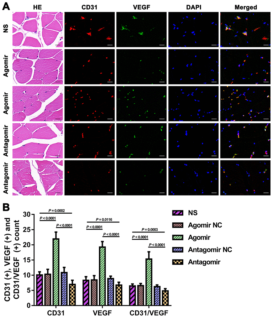 To determine the effects of EMS and miR-126-5p on EC proliferation, an immunofluorescence assay was performed. Briefly, sections were fixed in 4% paraformaldehyde in phosphate-buffered saline (PBS) for 5 min at room temperature, permeabilized, and blocked for 30 min with 0.1% Triton X-100 and 1% bovine serum albumin. Subsequently, the fixed sections were washed and incubated for 1 h with primary antibodies against vWF (1:200; Cell Signaling Technology, Shanghai, China), VEGF (1:200; Cell Signaling Technology), CD31 (1:100; Santa Cruz Biotechnology, Dallas, TX, USA), or eNOS (1:200; Cell Signaling Technology) overnight at 4°C. The sections were then washed three times with PBS and incubated with fluorescence-conjugated species-specific secondary antibodies. The samples were subsequently counterstained with 4’,6-diamidino-2-phenylindole (DAPI, Beyotime Biotechnology, Shanghai, China) for identification of the nuclei. Photographs were acquired using a fluorescence microscope. The quantities of vWF-, VEGF- and CD31-positive cells indicated the proliferation and distribution of capillary ECs. The quantities of eNOS-positive cells indicated the repair and proliferation of capillaries. For each group, the numbers of positively stained cells in five random visual fields (100 μm × 100 μm) were counted. All the experiments were performed in triplicate.