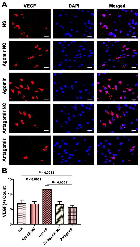 Adult male Sprague-Dawley rats (male, 250-300 g) were purchased from the animal center of Sun Yat-sen University, Guangzhou, China. The animals were adapted to the environment for 1 week before the experiments. All animal treatments and experiments were approved by the Institutional Animal Ethics Committee of Sun Yat-sen University, and their treatment conformed to the Guide for the Care and Use of Laboratory Animals of the National Institutes of Health (Publication No. 80-23, revised 1996). Twenty-four rats were used to detect the proliferation-promoting effects of EMS on ECs in the 2VO+EMS rat model (2VO sham group, 2VO group and 2VO+EMS group) (Figure 14A). Based on the different materials injected and transfected into the TM during EMS, the remaining rats were randomly divided into the following groups: 1) NS group, 2) agomir negative control (NC) group, 3) agomir group, 4) antagomir NC group, and 5) antagomir group (Table 3). The experimental schedule is presented in Figure 14B.