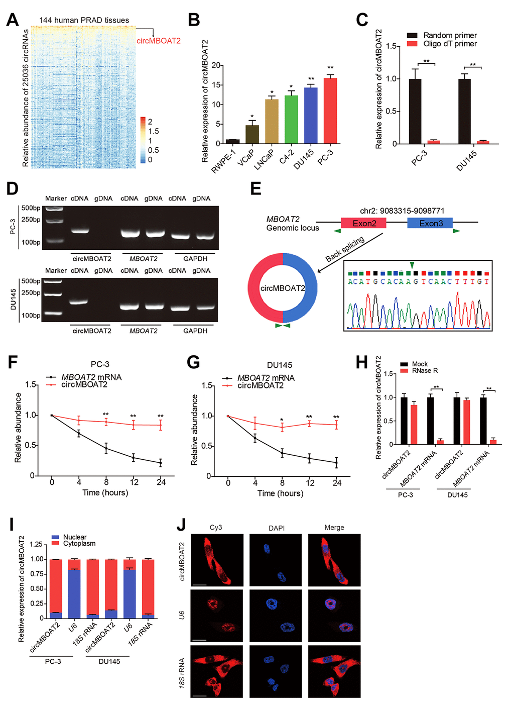 To identify the critical circRNAs involved in PCa progression, we analyzed published RNA-seq data (GSE113120) from human PCa tissue and found that circMBOAT2 was highly enriched in PCa (Figure 1A). Assessment of circMBOAT2 expression in prostate cancer and normal prostate cell lines showed that circMBOAT2 was significantly overexpressed in PCa cell lines (VCaP, LNCaP, C4-2B, DU145 and PC-3) compared to the normal prostate epithelial cell line RWPE-1 (Figure 1B). To verify the circular structure of circMBOAT2, we designed divergent primers to amplify the circMBOAT2 form and convergent primers to amplify another exon of the linear MBOAT2 mRNA. PCR and agarose gel electrophoresis showed that the circular form was detected in cDNA, while no amplification product was obtained from gDNA when using divergent primers (Figure 1D). Sanger sequencing of the PCR product determined the head to tail splicing of circMBOAT2, which was consistent with the results obtained from circBase, and indicated that circMBOAT2 was derived from exon 2 and exon 3 of the MBOAT2 gene (Figure 1E), supporting the closed circular structure of circMBOAT2. Moreover, reverse transcription experiments showed that circMBOAT2 was rarely detected when oligo-dT primers were used, indicating the deletion of the 3’ poly(A) tail in circMBOAT2 (Figure 1C). Meanwhile, circMBOAT2 was resistant to digestion by RNase R, a 3′to 5′ exoribonuclease, whereas the linear MBOAT2 mRNA showed sensitivity to RNase R treatment (Figure 1H), further demonstrating that circMBOAT2 exists as a circular RNA in PCa. Furthermore, an actinomycin D assay was preformed to verify the transcript half-life of circMBOAT2, which exceeded 24 h (Figure 1F, 1G), suggesting that the circular form is more stable than the linear mRNA counterpart. Subcellular fractionation assay and fluorescence in situ hybridization (FISH) indicated that circMBOAT2 is predominantly distributed in the cytoplasm (Figure 1I, 1J). These results demonstrate that circMBOAT2 is overexpressed in PCa cell lines and mainly localized in the cytoplasm as a highly stable circRNA.