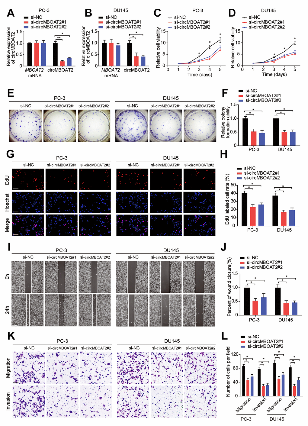 We next explored the functions of circMBOAT2 in PCa cells. The expression of circMBOAT2 was successfully downregulated or overexpressed in PC-3 and DU145 cells through siRNA (Supplementary Table 3) or expression plasmid transfection, respectively (Figure 2A, 2B, Supplementary Figure 1A, 1B). Transfection of the circMBOAT2 siRNA or expression vectors did not alter the linear MBOAT2 mRNA expression. CCK-8, colony formation, and EdU assays indicated that knockdown of circMBOAT2 inhibited cell proliferation in both PC-3 and DU145 cells (Figure 2C–2H). Overexpression of circMBOAT2 promoted cell proliferation (Supplementary Figure 1C–1H). Furthermore, wound healing and transwell assays demonstrated that the migratory and invasive capability of PCa cells were significantly attenuated with circMBOAT2 depletion (Figure 2I–2L), and enhanced after circMBOAT2 overexpression (Supplementary Figure 1I–1L). These data demonstrate that circMBOAT2 promotes proliferation, migration, and invasion of PCa cells in vitro.