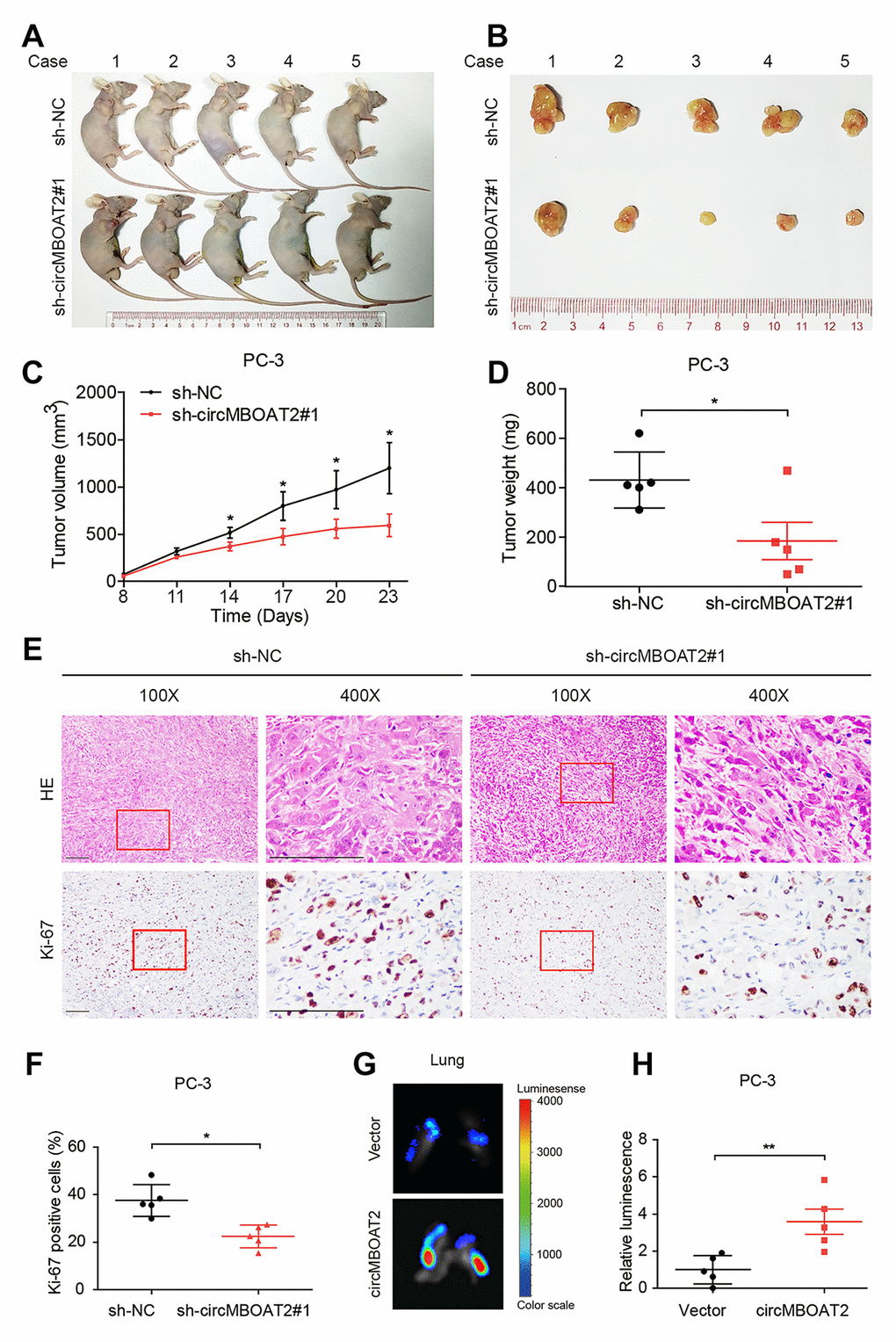 For the PC-3 cell line xenograft metastatic model, 1 × 106 stable luciferase-labeled PC-3 cells with the circMBOAT2 expression vector or empty vector were injected into the tail vein of BALB/c nude mice. After 4 weeks the lungs were excised and analyzed by fluorescence and a small animal imaging system (Neopanora, Zhuhai, China).