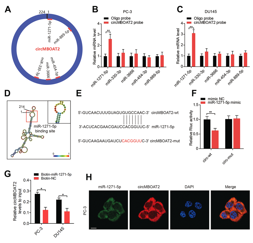 circRNAs can act as RNA sponges to interact with miRNAs in the cytoplasm [5]. As we had validated the cytoplasmic localization of circMBOAT2 in PCa cells, we determined whether circMBOAT2 interacted with miRNAs as a miRNA sponge in PCa. Predictions from three independent miRNA target databases (MiRanda, TargetScan, and RNAhybird) were compared, and five miRNAs (miR-1271-5p, miR-330-3p, miR-3666, miR-454-3p and miR-889-5p) were commonly predicted as potential binding partners of circMBOAT2 (Figure 4A). RNA pull-down assay with biotin-labeled circMBOAT2 probe and oligo probes showed that circMBOAT2 exhibited an adsorption affinity for miR-1271-5p in both PC-3 and DU145 cells (Figure 4B, 4C). Sequence analysis by RNAalifold [21] indicated that the miR-1271-5p binding site was located in the 1-7 nt region of circMBOAT2 (Figure 4D). To further validate the binding sequences of miR-1271-5p on circMBOAT2, we co-transfected miR-1271-5p mimics or non-targeting mimic (mimic NC) and a luciferase reporter containing the sequences of wild type or mutated circMBOAT2 into HEK 293T cells (Figure 4E). Compared with the mimic NC, miR-1271-5p significantly reduced the Rluc activity of the circMBOAT2-wt reporter, while no significant change was obtained when the binding site of miR-1271-5p was mutated, indicating these sequences represent regions of interaction between circMBOAT2 and miR-1271-5p (Figure 4F). Moreover, RNA capture assays revealed enrichment of circMBOAT2 with biotin-labeled miR-1271-5p, further confirming that circMBOAT2 interacted with miR-1271-5p (Figure 4G). Furthermore, FISH confirmed that circMBOAT2 and miR-1271-5p co-localized in the cytoplasm (Figure 4H). Together, these results suggest that circMBOAT2 functions as a miRNA sponge through direct targeting of miR-1271-5p.