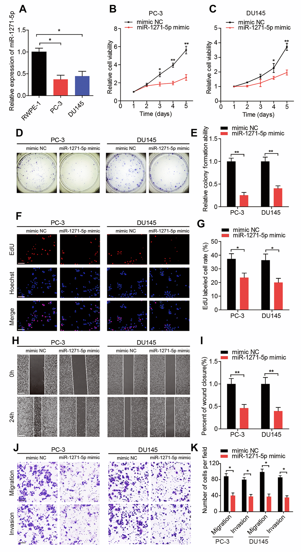 Given that circMBOAT2 acted as a sponge for miR-1271-5p, we next explored the function and downstream targets of miR-1271-5p in PCa cells. We found that miR-1271-5p was downregulated in human PCa cell lines compared with the RWPE-1 cells (Figure 5A). Moreover, miR-1271-5p overexpression significantly repressed the proliferation, migration, and invasion of PCa cells compared with the mimic NC (Figure 5B–5K). In contrast, the proliferation, migration, and invasion of PCa cells were enhanced when PCa cells were treated with a miR-1271-5p inhibitor (Supplementary Figure 2A–2J). In addition, the expression of miR-1271-5p in PCa tissues and matched normal adjacent tissues was detected by qRT-PCR. The results showed that the expression of miR-1271-5p was significantly downregulated in PCa tissues compared with matched normal adjacent tissues and lower miR-1271-5p expression levels were significantly correlated with shorter disease-free survival (DFS) (Supplementary Figure 3A, 3B). Moreover, we found a negative correlation between circMBOAT2 and miR-1271-5p expression, which suggesting that circMBOAT2 acts as a sponge for miR-1271-5p in PCa tissues (Supplementary Figure 3C).