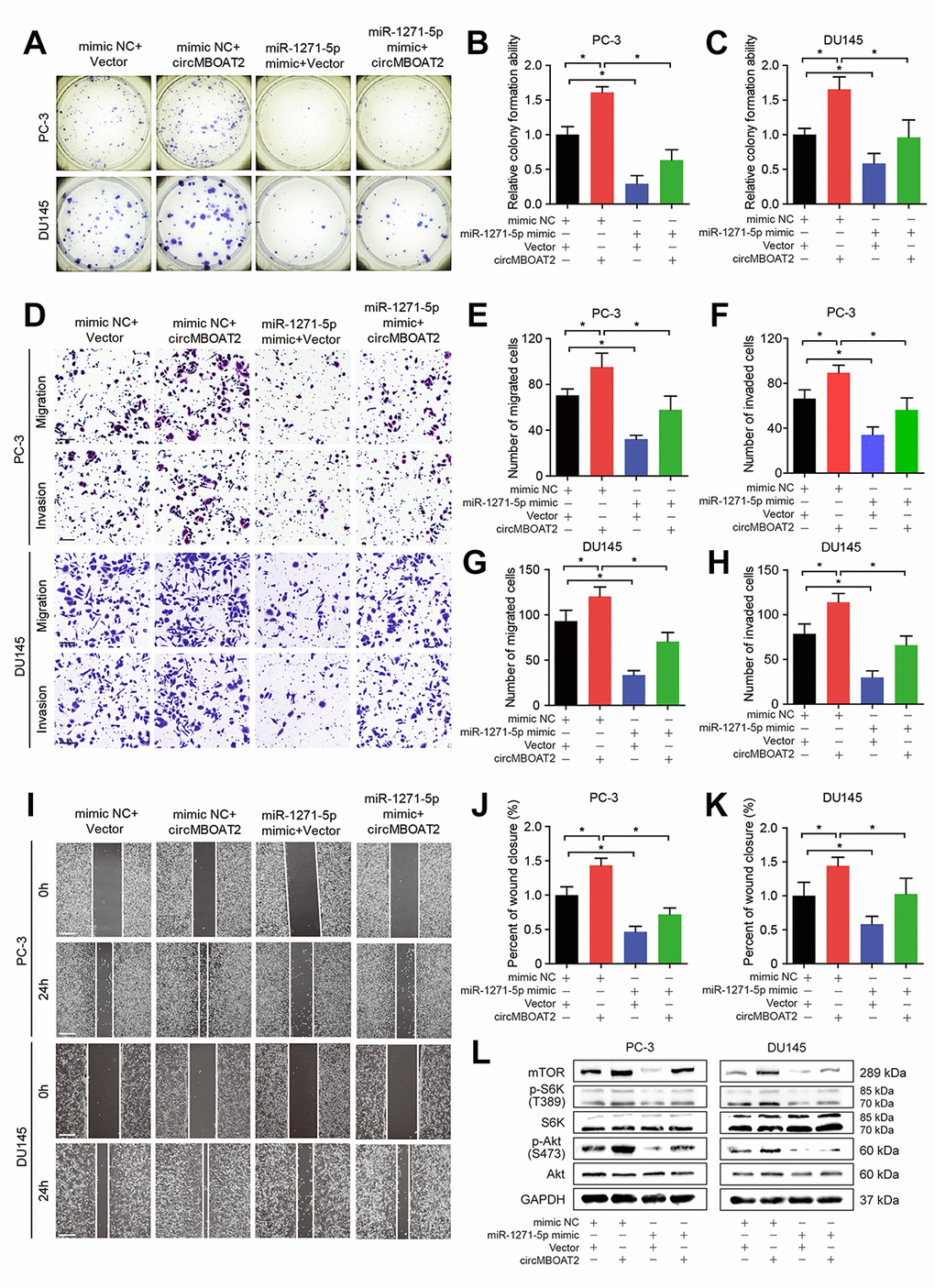 Next, we further evaluated whether circMBOAT2 can regulate mTOR expression and PCa progression by acting as a sponge for miR-1271-5p. Overexpression of circMBOAT2 overexpression upregulated expression of mTOR, mTORC1 substrate p-S6K, and mTORC2 substrate p-Akt (Figure 7L), indicating activation of the PI3K/Akt pathway, while transfection with miR-1271-5p mimic partly reversed these effects (Figure 7L). Moreover, the CCK-8 and colony formation assays showed that transfection with miR-1271-5p mimic reduced circMBOAT2-induced proliferation in PCa cells (Supplementary Figure 4A, 4B, Figure 7A–7C), suggesting that miR-1271-5p could partly repress the oncogenic role of circMBOAT2. Wound healing assays demonstrated that miR-1271-5p overexpression reversed the enhanced migration induced by circMBOAT2 (Figure 7I–7K). In addition, transwell assays revealed that circMBOAT2 enhanced the migratory and invasive abilities of PCa cells, while miR-1271-5p overexpression attenuated migration and invasion in circMBOAT2-transduced PCa cells (Figure 7D–7H). Altogether, these data confirm that circMBOAT2 upregulates mTOR expression and activates PI3K/Akt signaling to promote proliferation, migration, and invasion of PCa cells by sponging miR-1271-5p.