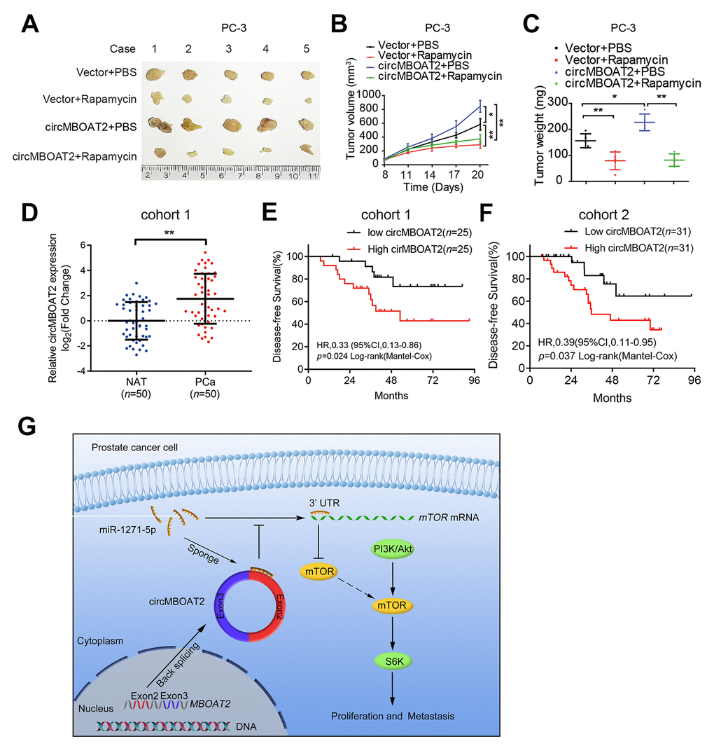 mTOR is a crucial activator of the PI3K/Akt pathway, and targeting mTOR has been reported as an effective approach to suppress tumor progression. As our results indicated that circMBOAT2 promoted mTOR expression in PCa cells, we investigated whether the oncogenic effects of circMBOAT2 could be eliminated inhibiting mTOR. Western blot showed that the circMBOAT2-induced increase of phosphorylation of S6K and Akt in PC-3 cells were significantly reduced by treatment with rapamycin (Supplementary Figure 5A), a widely used mTOR inhibitor [23]. In vitro experiments suggested that rapamycin can reverse the enhanced cell proliferation, migration, and invasion caused by circMBOAT2 (Supplementary Figure 5B–5H). To further evaluate the efficacy of rapamycin on circMBOAT2-induced enhancement of PCa tumor progression in vivo, subcutaneous xenograft models were constructed using PC-3 cells stably transfected with vector or circMBOAT2. The tumor-bearing mice were treated with 10 mg/kg rapamycin or PBS. Overexpression of circMBOAT2 promoted tumor growth, and this oncogenic effect of circMBOAT2 was significantly attenuated by rapamycin treatment (Figure 8A–8C). Additionally, Akt inhibitor MK-2206 and PI3K inhibitor GDC-0941 could also rescue the oncogenic effect of circMBOAT2 in PC-3 cells (Supplementary Figure 6A–6J). These results demonstrate that circMBOAT2 promotes PCa progression through an mTOR-dependent pathway, which can be abolished by treatments with PI3K/Akt/mTOR signaling pathway inhibitors.