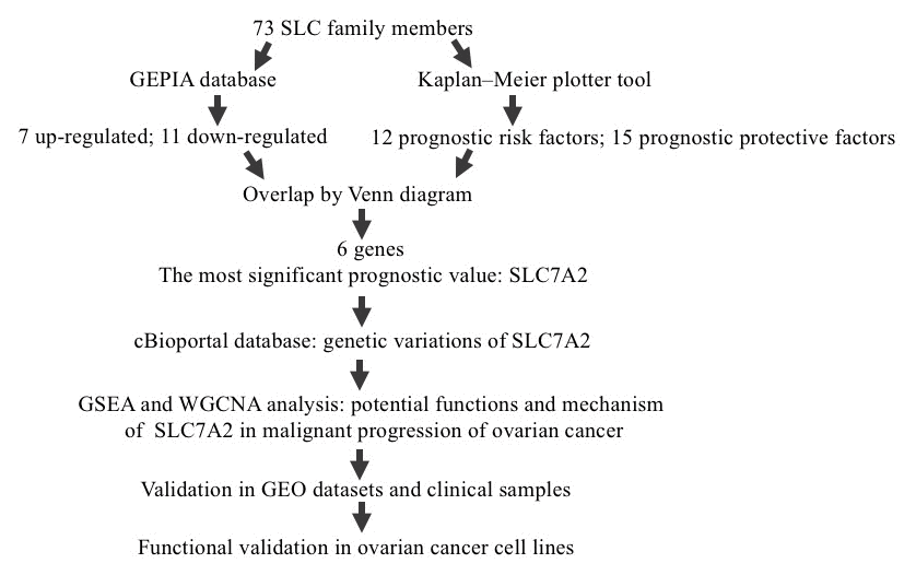 The solute carrier (SLC) superfamily is the second largest family of membrane proteins and the largest group of transporters, which comprise more than 420 members from 65 families [5, 6]. Acting as cotransporters, uniporters or channels, SLCs mediate the movement of substrates across membranes based on electrochemical or ion gradients and transport a diverse range of substances, including ions, drugs, and metabolites [6, 7]. SLC dysfunction can lead to a variety of diseases, such as diabetes, Alzheimer's disease, and heart disease [8–10]. Moreover, emerging evidence suggests that SLCs are involved in the genesis and progression of various cancers, including bladder urothelial carcinoma, colorectal cancer, and breast cancer [11–13]. However, few studies have been demonstrated the role SLCs paly in ovarian cancer and thus it’s worth further explorations. As important nutrients in human body, various amino acids like glutamine, asparagine, serine, and arginine have exhibited association with tumorigenesis and prognosis of cancers, including ovarian cancer [14, 15]. In terms of SLC families, amino acid transport is mediated by members of the SLC1, SLC3/7, SLC6, SLC25, SLC32, SLC36, SLC38, and SLC43 families [16]. However, their functions in ovarian cancer remain unclear.