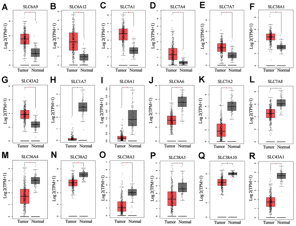 The overall design of this study is shown in Figure 1. We compared the mRNA expression levels of the 73 SLC family members between ovarian cancers and normal ovarian tissues in the GEPIA database (Supplementary File 1). Eighteen SLC family members were identified to be significantly differentially expressed (p<0.01) (Figure 2A–2R), among which seven members were significantly upregulated (SLC6A9, SLC6A12, SLC7A1, SLC7A4, SLC7A7, SLC38A1, and SLC43A2) while eleven members were downregulated (SLC1A7, SLC6A1, SLC6A6, SLC7A2, SLC7A8, SLC36A4, SLC38A2, SLC38A3, SLC38A5, SLC38A10 and SLC43A1).
