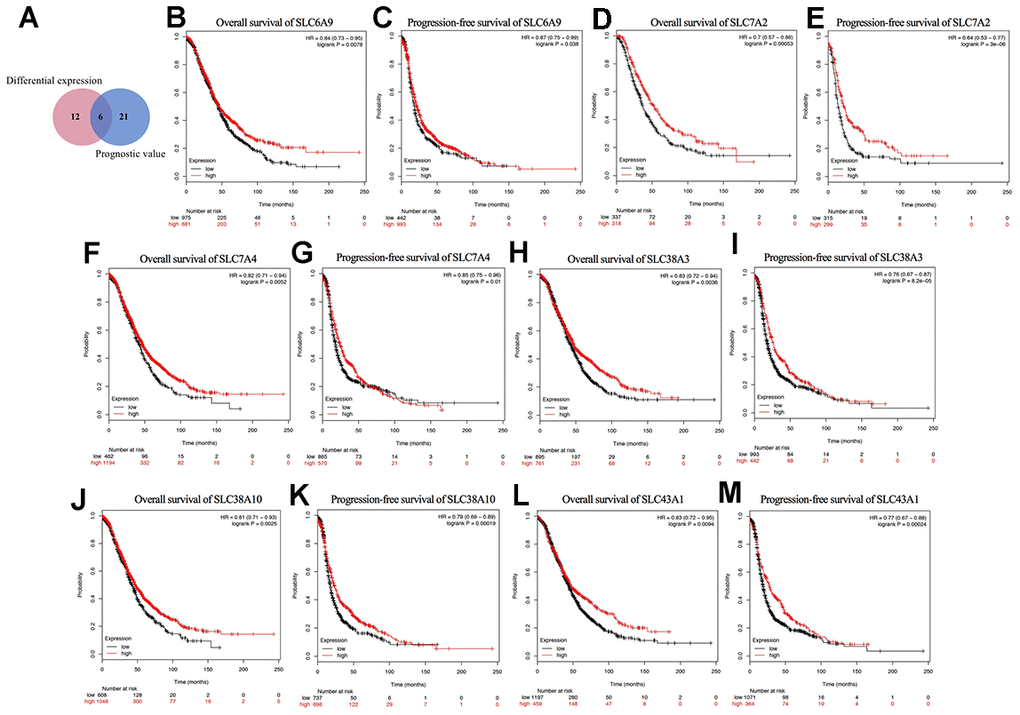 As shown in Figure 4A, a Venn diagram was generated to explore the intersection of the genes with significant differential expression and the genes with prognostic value, where six genes were identified: SLC6A9, SLC7A2, SLC7A4, SLC38A3, SLC38A10, and SLC43A1. Their Kaplan-Meier plots for OS and PFS are shown in Figure 4B–4M. Among the six genes, SLC7A2 showed the most significant prognostic value for both OS and PFS. The median OS values were 52.43 and 36.57 months and the median PFS values were 22.41 and 14 months for the high and low SLC7A2 expression groups, respectively. Therefore, we identified SLC7A2 as a marker associated with survival in ovarian cancer and focused on SLC7A2 in further exploration.