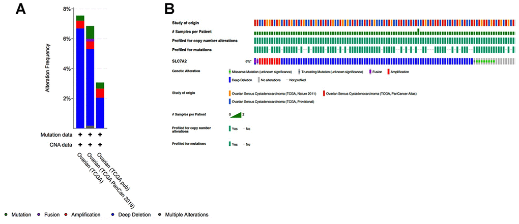 To determine if downregulation of SLC7A2 in ovarian cancer tissues were caused by genetic variations, we assessed genetic variations of SLC7A2 in the cBio-Portal database which contained information on 1680 ovarian cancer cases from three studies (TCGA, Nature 2011; TCGA, PanCancer Atlas; TCGA, Provisional). In this database, genetic variations of SLC7A2 showed incidence rates of 7.55% in TCGA, 6.85% in TCGA PanCancer Atlas, and 3.07% in TCGA Provisional (Figure 5). Deep deletion was the most common type, comprising more than half of all genetic variations (6.69% in TCGA; 5.14% in TCGA PanCancer Atlas; and 2.04% in TCGA Provisional). Mutation and amplification were the next most common types of genetic variations. Therefore, deep deletion might be one of the main mechanisms by which SLC7A2 is under-expressed in ovarian cancer.