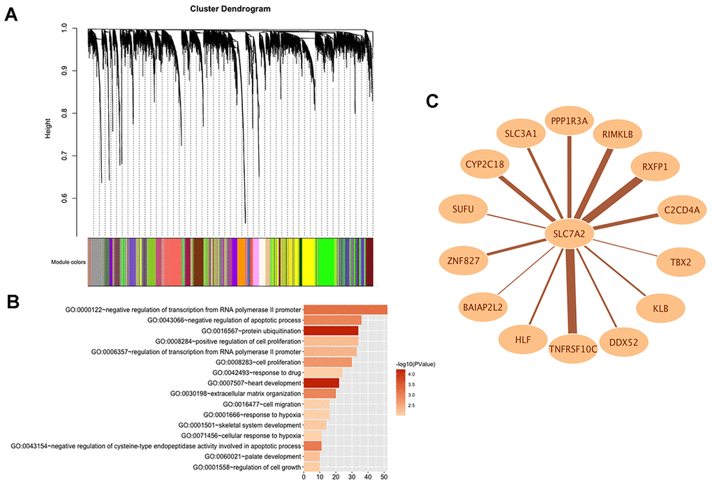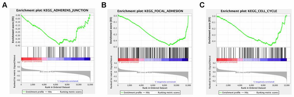 In order to explore the potential functions and molecular mechanisms of SLC7A2 in ovarian cancer progression, we conducted Gene Set Enrichment Analysis (GSEA) in ovarian cancer tissues from TCGA database, which indicated enrichments of gene sets including adherens junction, focal adhesion and cell cycle in the samples with low SLC7A2 expression (Figure 6). We further analyzed the transcriptomic data of 44 ovarian cancer cell lines in CCLE database by Weighted Correlation Network Analysis (WGCNA). We used 20,486 genes to construct 88 modules (Figure 7A). The genes enriched in these modules were listed in Supplementary File 2. 943 genes, including SLC7A2, were enriched in the brown module. Functional enrichment analysis was carried out for the 943 genes and we found these genes were significantly associated with several processes that have been previously reported in tumorigenesis and progression of ovarian cancer, such as ‘protein ubiquitination’, ‘negative regulation of transcription from RNA polymerase II promoter’, ‘negative regulation of apoptotic process’ and ‘cell proliferation’ [22–24]. The terms with p-value < 0.01 and counts > 10 was shown in Figure 7B. What’s more, fourteen genes in the brown module were found connected with SLC7A2 and were visualized in network in Figure 7C.