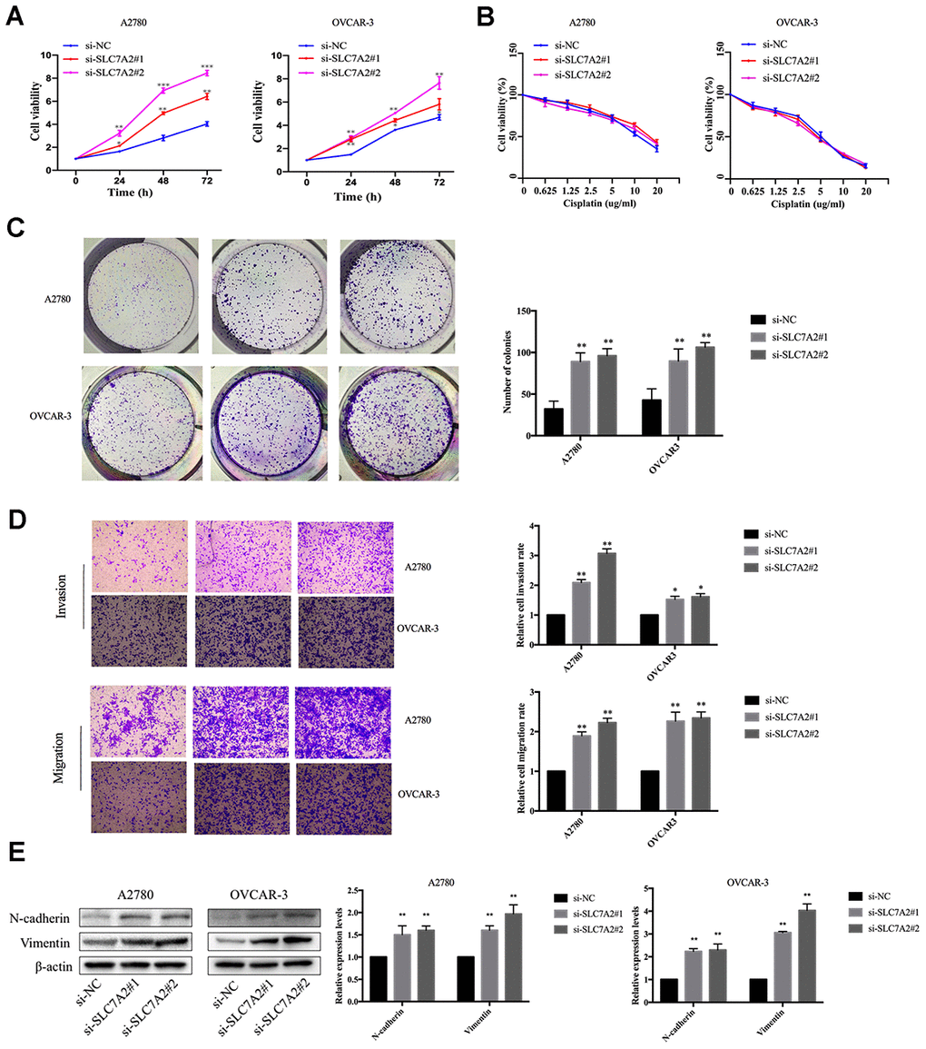 We performed functional experiments after knockdown of SLC7A2 by siRNAs in the A2780 and OVCAR-3 cell lines to validate the function of SLC7A2 in ovarian cancer. We used reverse transcription quantitative polymerase chain reaction (qRT-PCR) to examine the efficiency of knockdown (Supplementary Figure 1). The Cell Counting Kit-8 (CCK-8) experiments showed that an SLC7A2 decrease augmented cell viability (Figure 9A). Cisplatin resistance was one of the causes of ovarian cancer recurrence [4], so we explored whether SLC7A2 is related to ovarian cancer's reactivity to cisplatin. SLC7A2 knockdown had no effect on the sensitivity of ovarian cancer cells to cisplatin treatment (Figure 9B). We found that knockdown of SLC7A2 promoted colony formation (Figure 9C). The Transwell experiments showed increased invasion and migration ability of ovarian cancer cells after SLC7A2 knockdown (Figure 9D). The protein levels of markers of epithelial-mesenchymal transition, including N-cadherin and vimentin, showed consistent changes with the Transwell results (Figure 9E).