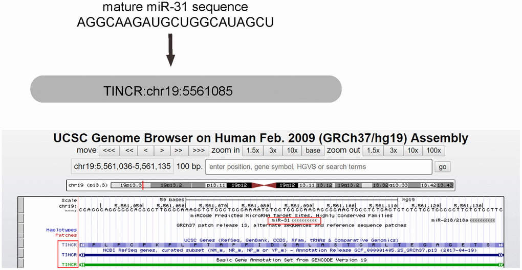 Using miRcode (http://www.mircode.org/mircode), we found that miR-31 is one special TINCR-targeting miRNA (Figure 1). Moreover, miR-31 is well known to dramatically upregulate in CRC and acts as an oncogenic miRNA through many genes [23–28]. Since TINCR was decreased in CRC [21], we thought that miR-31 may be a good candidate to study as a possible sponge miRNA for TINCR (Table 1).