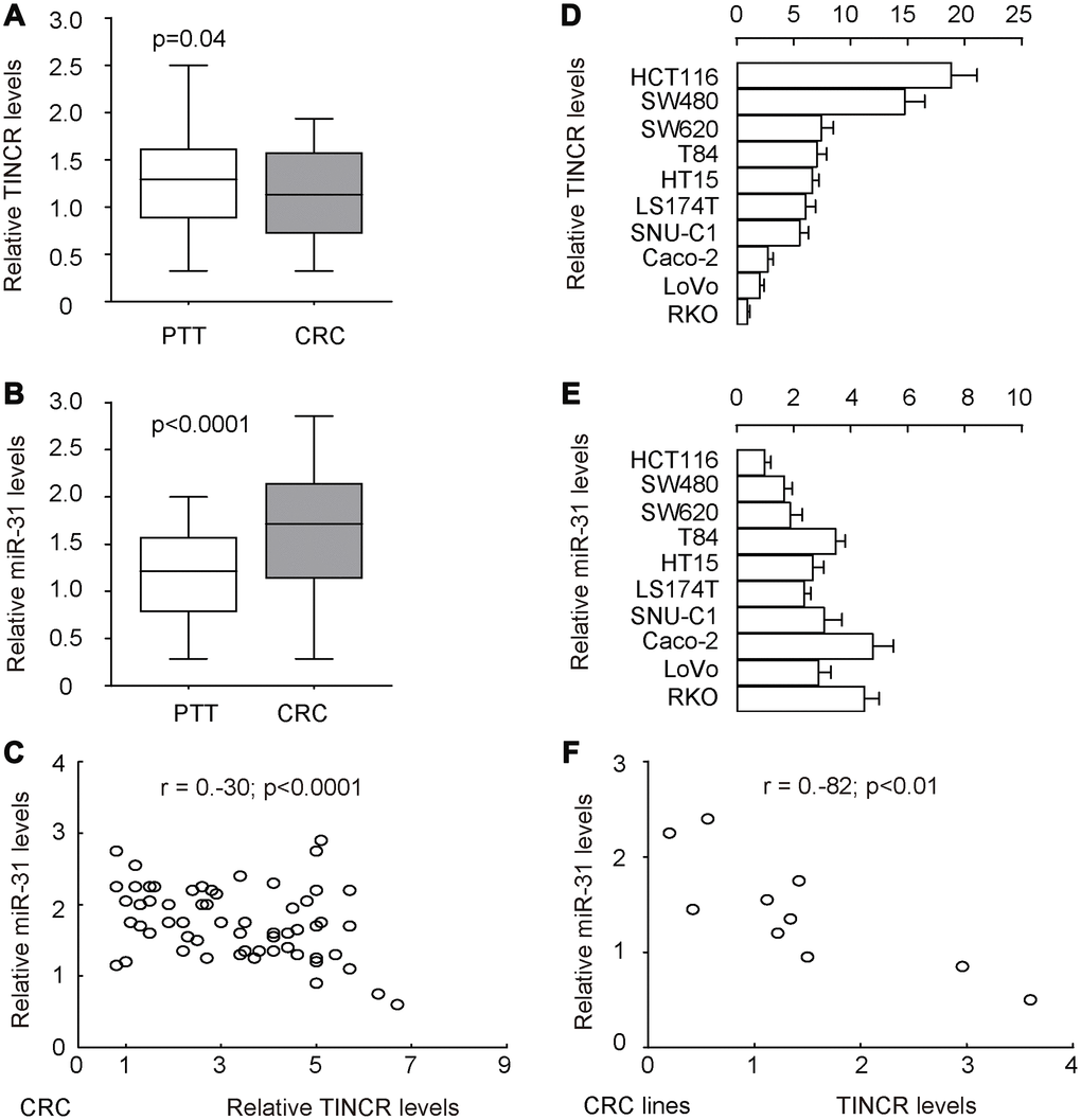 TINCR and miR-31 levels inversely correlate in CRC tissues and cell lines