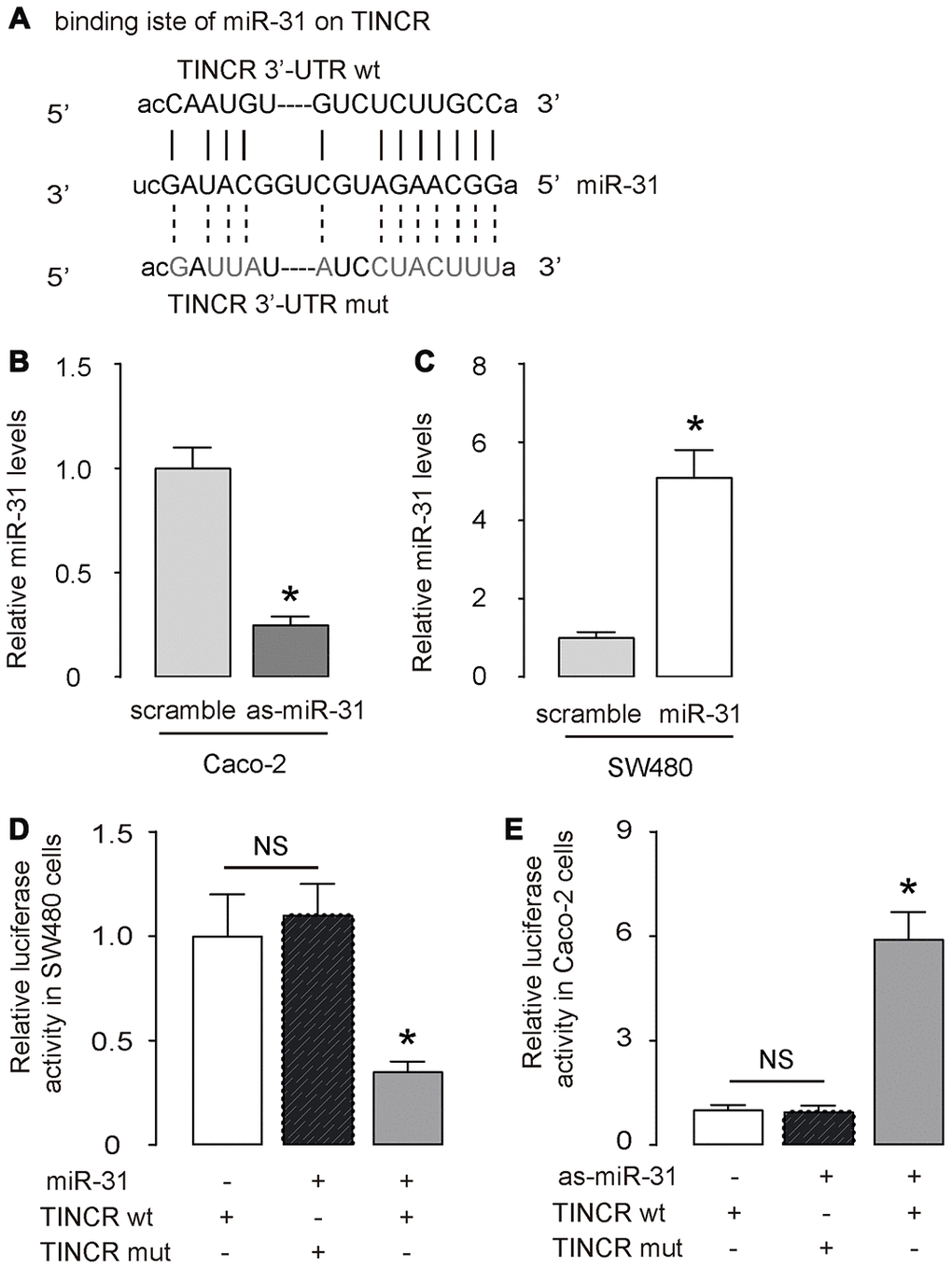 Next, the binding (site) between TINCR and miR-31 was predicted by StarBase (http://starbase.sysu.edu.cn/) (Figure 3A). We thus prepared luciferase reporter for wildtype (wt) TINCR and TINCR with a mutant at the miR-31 binding site (mut) (Figure 3A). CaCO2 cells expressed relatively high miR-31 and low TINCR (Figure 2D, 2E), and thus were selected as the cell line for depleting miR-31 or for overexpressing TINCR. SW480 cells expressed relatively low miR-31 and high TINCR (Figure 2D, 2E), and thus were selected as the cell line for overexpressing miR-31 or for depleting TINCR. First, transfection with as-miR-31 significantly reduced miR-31 levels in Caco-2 cells (Figure 3B), while transfection with miR-31 significantly increased miR-31 levels in SW480 cells (Figure 3C). LncRNA can serve as a molecular sponge to interact with miRNAs [29]. Thus, we performed a luciferase reporter assay to examine whether TINCR could interact with miR-31 in CRC cells. In SW480 cells, the transfection of miR-31 markedly reduced the luciferase activity of TINCR-wt (p<0.05), whereas the luciferase activity of the TINCR-mut was unaffected upon miR-31 upregulation (Figure 3D). Moreover, in Caco-2 cells, the transfection of as-miR-31 markedly increased the luciferase activity of TINCR-wt (p<0.05), whereas the luciferase activity of the TINCR-mut was unaffected upon miR-31 downregulation (Figure 3E). Together, these data suggest that TINCR is a molecular sponge to interact with miR-31 in CRC.