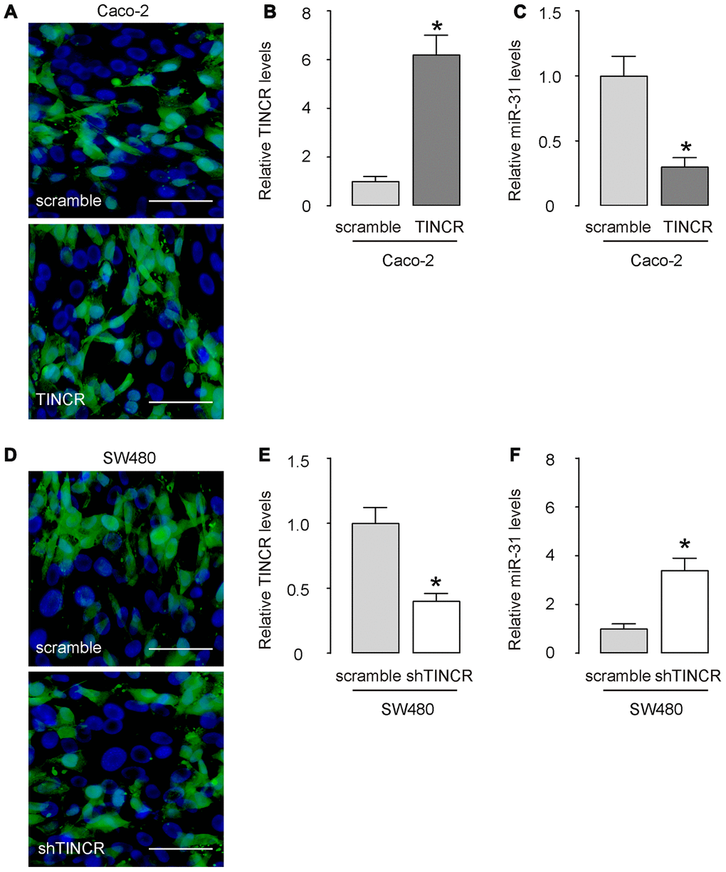 Next, we prepared plasmids that overexpress or deplete TINCR in CRCs. Transfection with TINCR significantly increased TINCR levels in Caco-2 cells (Figure 4A, 4B), while transfection with shTINCR significantly decreased TINCR levels in SW480 cells (Figure 4C, 4D).