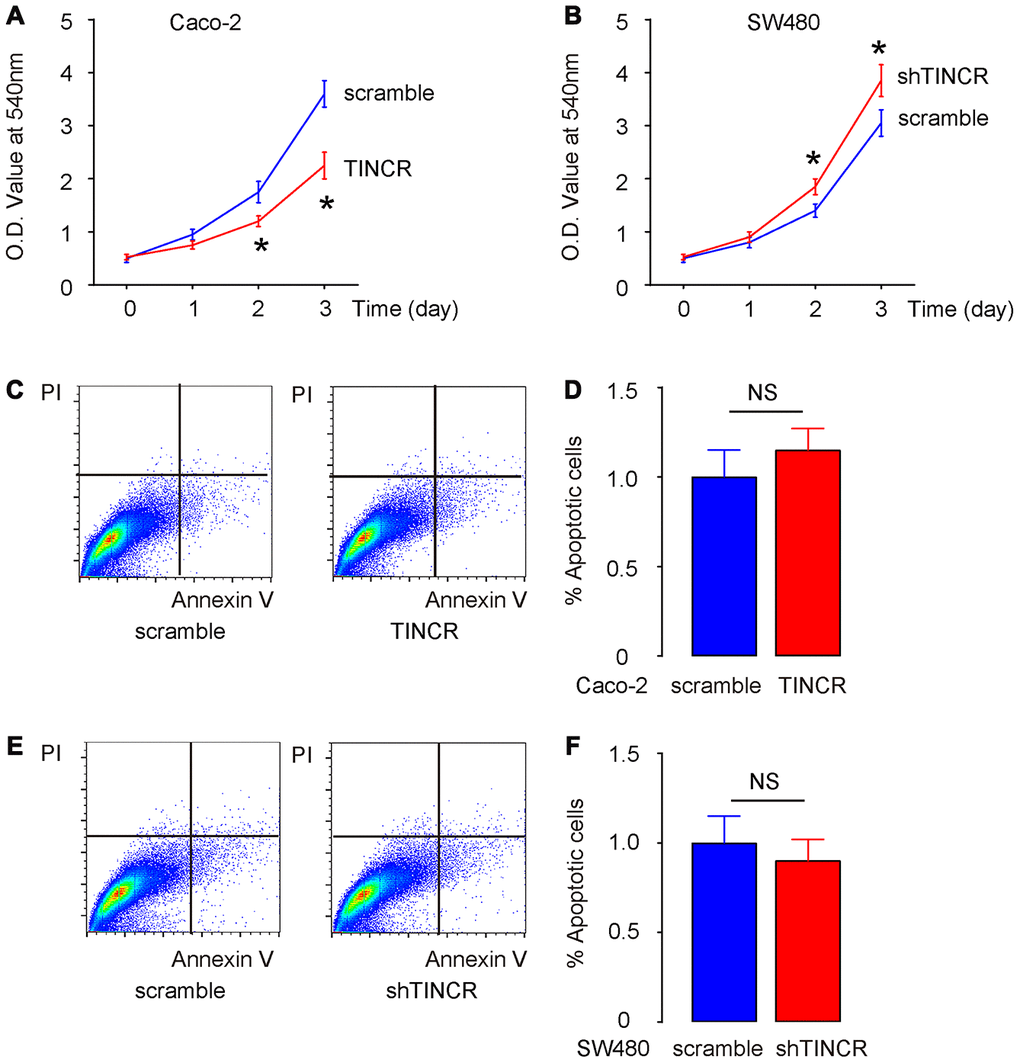 Then, we examined the effects of TINCR modification on CRC cell growth in vitro. First, the CCK-8 assay was performed to evaluate the influence of TINCR overexpression or depletion on CRC cell growth. The absorbance was significantly lower in TINCR-transfected Caco-2 cells (Figure 5A), and significantly higher in shTINCR-transfected SW480 cells (Figure 5B). However, neither overexpression of TINCR in Caco-2 cells (Figure 5C, 5D), nor depletion of TINCR in SW480 cells (Figure 5E, 5F), appeared to significantly alter apoptosis. Thus, the effects of TINCR on CRC growth should be mediated through cell proliferation, rather than through cell apoptosis.