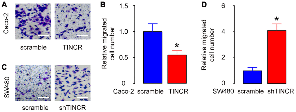 The migration of CRC cells in vitro was then examined in TINCR-modified CRC cells. The transwell migration assay showed that the overexpression of TINCR suppressed the migratory ability of Caco-2 cells, shown by representative images (Figure 6A) and by quantification (p<0.05, Figure 6B). On the other hand, depletion of TINCR increased the migratory ability of SW480 cells, shown by representative images (Figure 6C) and by quantification (p<0.05, Figure 6D). Thus, suppression of TINCR promotes CRC cell metastasis in vitro.