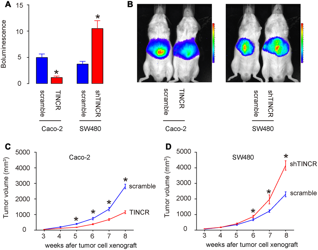 In vivo xenograft experiments were conducted to analyze the role of TINCR on tumor growth in vivo. Caco-2 cells transduced with lentivirus carrying TINCR or scramble with luciferase, and SW480 cells transduced with lentivirus carrying shTINCR or scramble with luciferase, were subcutaneously injected into the NOD/SCID mice. The formation of xenograft-derived tumor was measured every week. After 8 weeks, the quantification of tumor formation in living animals was performed using bioluminescence detection system. The increase in TINCR expression inhibited Caco-2 tumor cell growth in vivo, shown by quantification (p<0.05, Figure 7A), and by representative images (Figure 7B). While the decrease in TINCR expression enhanced SW480 tumor cell growth in vivo, shown by quantification (p<0.05, Figure 7A), and by representative images (Figure 7B). These data were consistent with the weekly measurement of tumor volume (Figure 7C–7D). Collectively, the overexpression of TINCR inhibits CRC growth through suppression of miR-31.