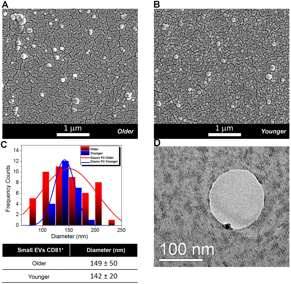 The resuspended small EV pellets from FF (10 μl) from both older and younger women were fixed in 100 μl of 3% formaldehyde-0.1 % glutaraldehyde in 0.1 M phosphate buffer overnight at 4°C. A drop of suspension (5 μl) was layered onto a sterile cover glass coated with 0.1% poly-L-Lysine, post-fixed in 1% osmium tetroxide (Merck, Darmstadt, Germany) in the same buffer for 1h at 4°C and washed in phosphate buffer. After dehydrating in graded ethanol and critical point drying, the samples were sputtered with a 5nm gold layer using an Emscope SM 300 (Emscope Laboratories, Ashford, UK) and then observed with a SUPRA 25 ZEISS microscope, at a working distance of 3-5 mm and in low accelerating voltage conditions of 2kV by using an in-lens detector. All the SEM micrographs were then analyzed by ImageJ software for image processing to measure the EV diameter statistics (https://imagej.nih.gov/ij/index.html).