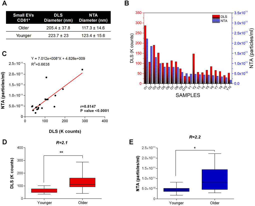 DLS and NTA were used to estimate the number of suspended vesicles in aqueous solutions (Figure 2B, 2C). DLS shows that the number of FF small EVs was significantly increased in the FF from older women by a factor of 2.1 with a P-value <0.01 (Figure 2D). Similarly, NTA confirmed a significantly higher concentration of small EVs in the FF from older women (1.1x 1011 EVs/mL) with respect to younger women (4.5 x1010 EVs/mL): the ratio was 2.2 with a P-value <0.05 (Figure 2E). Moreover, we found a strong dependence of the scattered light intensity (in Kilocounts-per-second, Kcps) on the nanoparticle concentration (Pearson correlation 0.8147, P-value < 0.0001) (Figure 2B).
