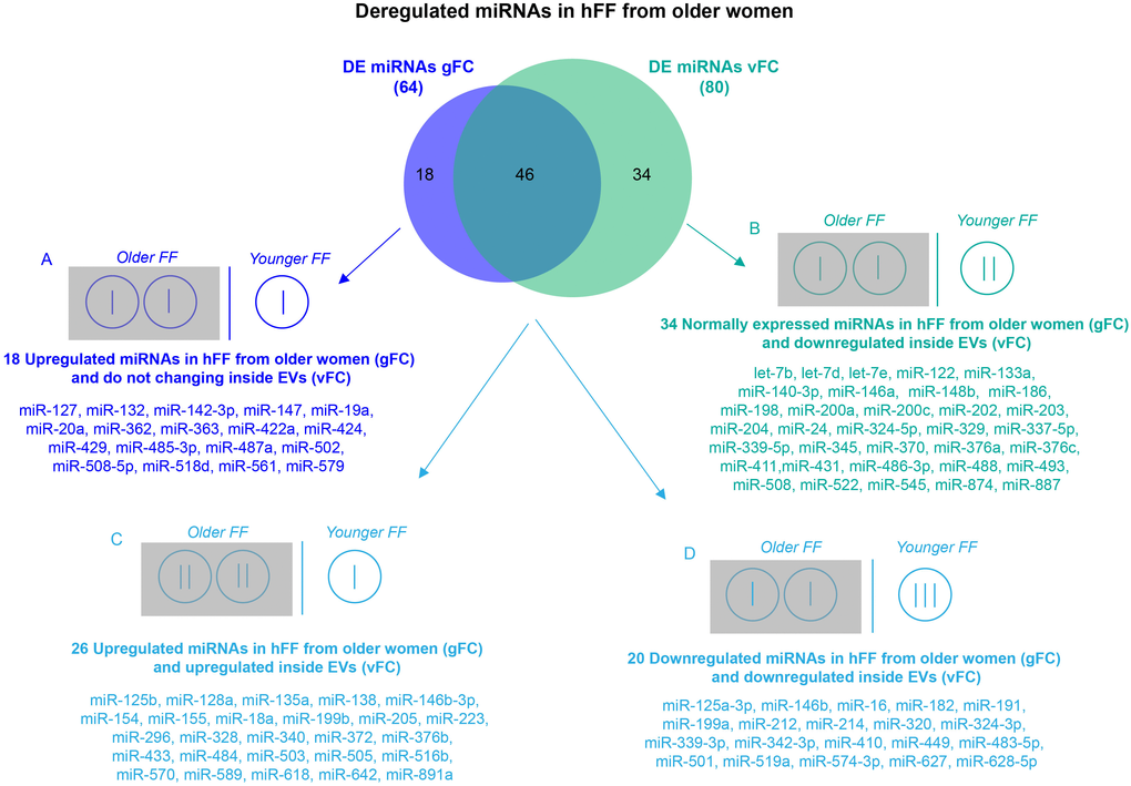 In conclusion, we demonstrated, for the first time, the increase in the number of small EVs in the FF from older women, caused by an enhanced release from somatic follicular cells and potentially mediated by TP53 signaling pathways. By comparing the standard normalization protocol with a normalization method, which associates miRNA profiles with the number of vesicles and by using different bioinformatics tools, we identified six miRNAs deregulated in the FF from older women. Their altered profiles could influence, at the same time, oocyte maturation, stress responses and vesicle secretion. We suggest that these are among the most important miRNAs, whose deregulation is responsible for the alterations involved in reproductive aging: accordingly, they could be used as non-invasive biomarkers of oocyte quality and also as potential targets of personalized therapies. Finally, we highlight the importance of the connection between miRNA profiles and vesicle quantity in biological fluids in order to detect as DE only the most significant molecules.