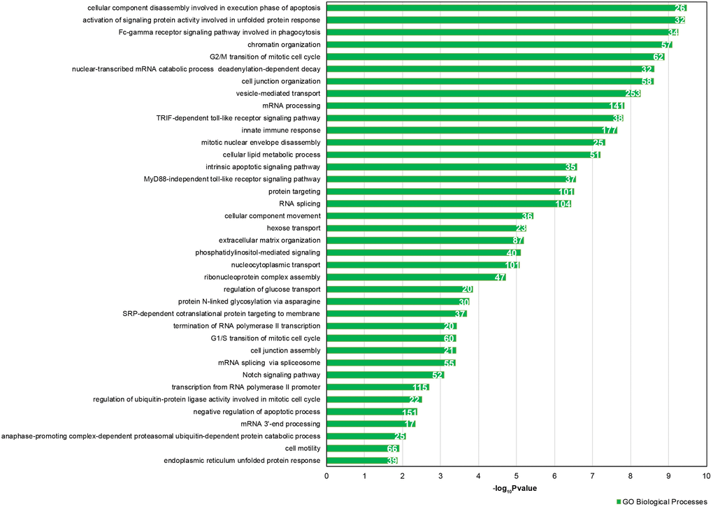 Gene Ontology, pathway and network analyses confirmed that the validated mRNA targets of the 46 identified miRNAs are involved in biological processes altered in reproductive aging, such as oocyte maturation and stress response (Figures 4–6). It is well known that oocyte quality decreases in women of advanced reproductive age. One of the most negative events is the increase of non-disjunction meiotic errors. This determines an enhanced aneuploidy rate in the embryo and the consequent reduction of fertility due to miscarriages or to the birth of newborns affected by aneuploidy [4]. Moreover, many papers have suggested the involvement of oxidative stress in oocyte aging. In the aged ovary, the balance between generation and elimination of reactive oxygen species (ROS) is impaired, which causes an increase of oxidative stress inside the ovarian follicles from aged women [28, 29].