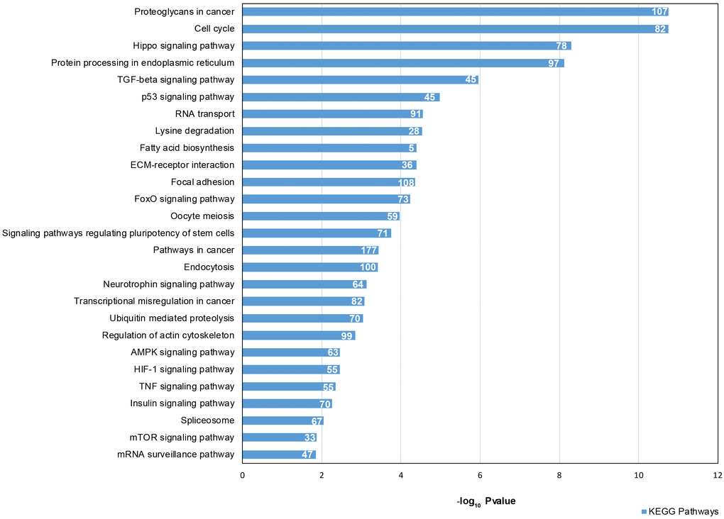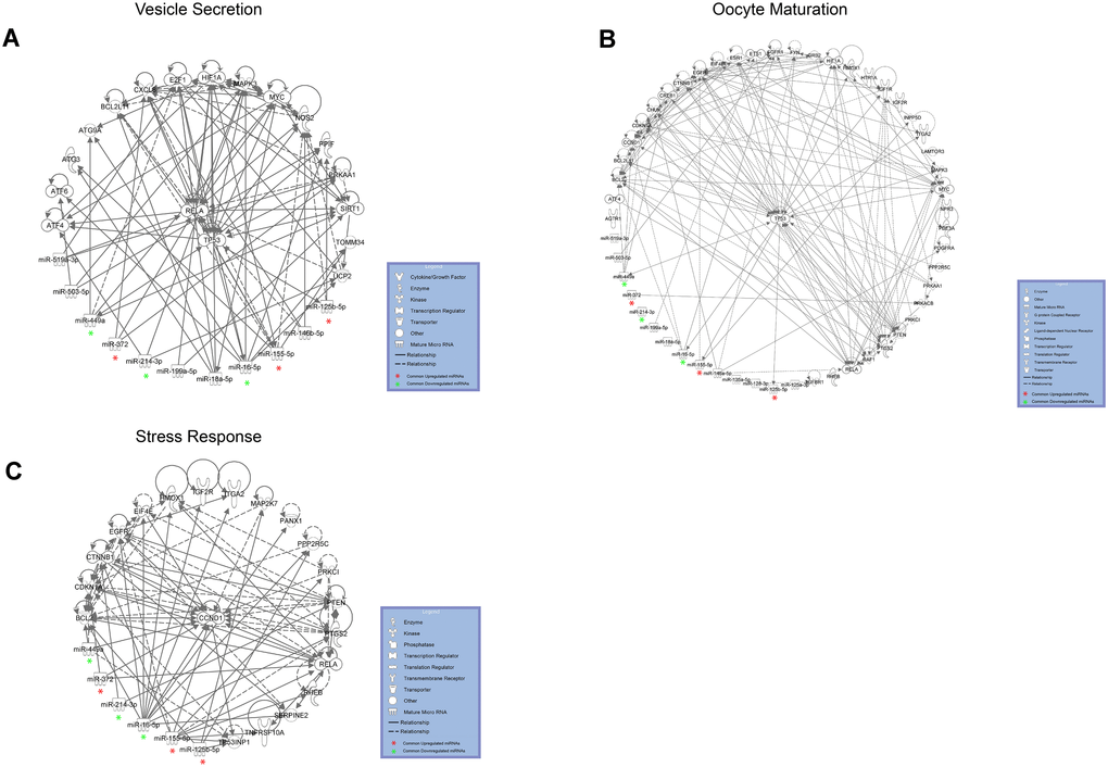 We focused our attention on the 46 DE common miRNAs (Figure 3C, 3D) and investigated their function for Gene Ontology (GO) classification and signaling pathway enrichment. Based on GO, most of the protein-encoding genes regulated by the identified miRNAs were involved in biological processes related to vesicle-mediated transport, mRNA processing, apoptotic signaling, nucleocytoplasmic transport, protein targeting and chromatin organization (Figure 4). Pathway analysis showed that the validated targets related to DE common miRNAs were involved in the regulation of 27 signaling pathways. Among the most significant, we found oocyte meiosis, mTOR signaling pathway, FoxO signaling pathway, p53 signaling pathway, HIF-1 signaling pathway and protein processing in the endoplasmic reticulum (Figure 5). The three networks, built on the 46 DE common miRNAs and enriched in the pathways involved in the regulation of oocyte maturation, stress response and vesicle secretion, comprise 14, 6 and 11 DE miRNAs, respectively (Figure 6). Six miRNAs are shared among the three networks: specifically, we identified miR-16-5p, miR-214-3p and miR-449a as downregulated, and miR-125b, miR-155-5p and miR-372 as upregulated (Figure 6). Moreover, TP53 is the central node in two of the three networks (Figure 6A, 6B) and RELA and CCND1 represent other central genes in these regulatory networks (Figure 6A, 6C).