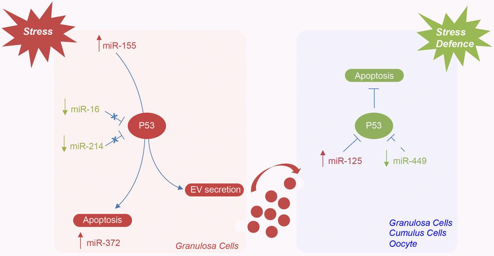 We propose that the higher number of small EVs in the FF from older women depends on an increase of vesicle secretion from somatic follicular cells, mediated by TP53, which, in turn, is activated in response to oxidative stress within the aged ovary (Figure 7). In our model, TP53 activation could be mediated by the downregulation of miR-16 and miR-214 (which act directly by binding to the TP53 mRNA) [46, 47]. TP53 activation could initiate the apoptotic process or cellular senescence in aged follicles and, at the same time, cause the increase of small EV secretion. The upregulation of miR-125 (which directly targets TP53) and the downregulation of miR-449 (which indirectly inhibits TP53 by binding SIRT1 mRNA) could represent a defense mechanism, implemented by follicular cells, to repress TP53 expression and stress-induced apoptosis [47, 48]. An antagonistic interplay in TP53 regulation has been demonstrated in cells under genotoxic stress [49].