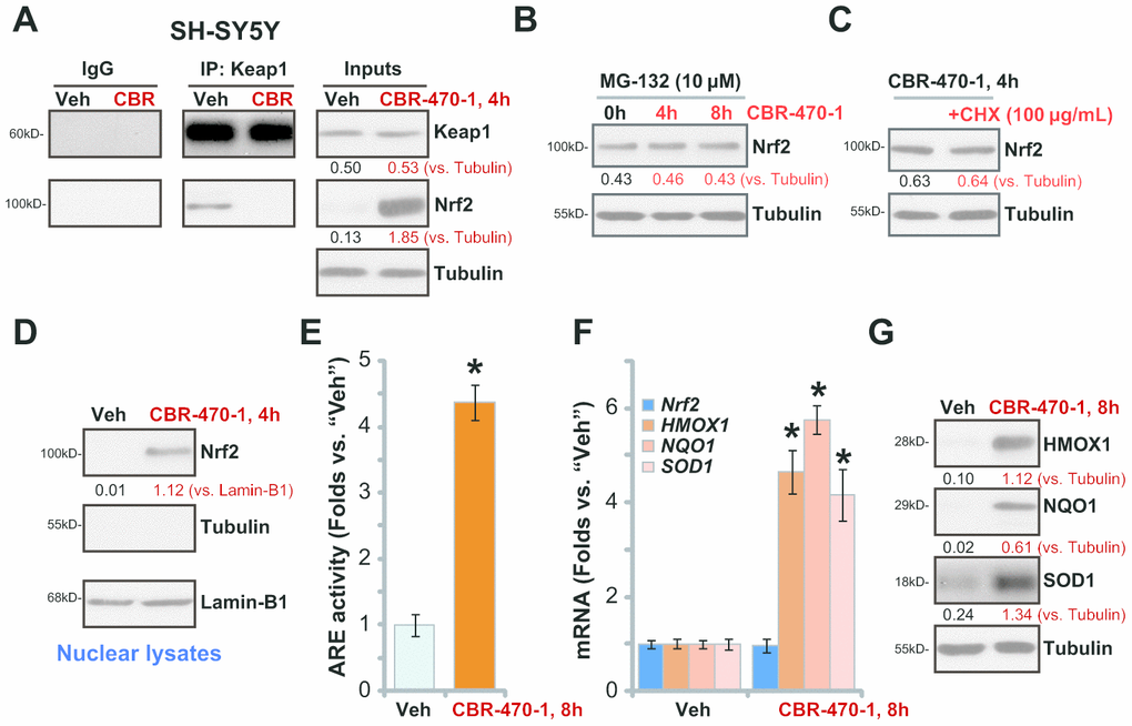 CBR-470-1 is a known PGK1 inhibitor. To study whether CBR-470-1 can activate the Nrf2 cascade in DA neuronal cells, we first examined Keap1-Nrf2 association using a co-immunoprecipitation (Co-IP) assay. As demonstrated, Figure 1A, in control vehicle-treated SH-SY5Y cells Keap1 immunoprecipitated with Nrf2, whereasCBR-470-1 treatment (10 μM, 4h) disrupted the interaction. Furthermore, Nrf2 protein levels were significantly increased following Keap1-Nrf2 disassociation in CBR-470-1-treated SH-SY5Y cells, whereas Keap1 expression remained unchanged (Figure 1A).