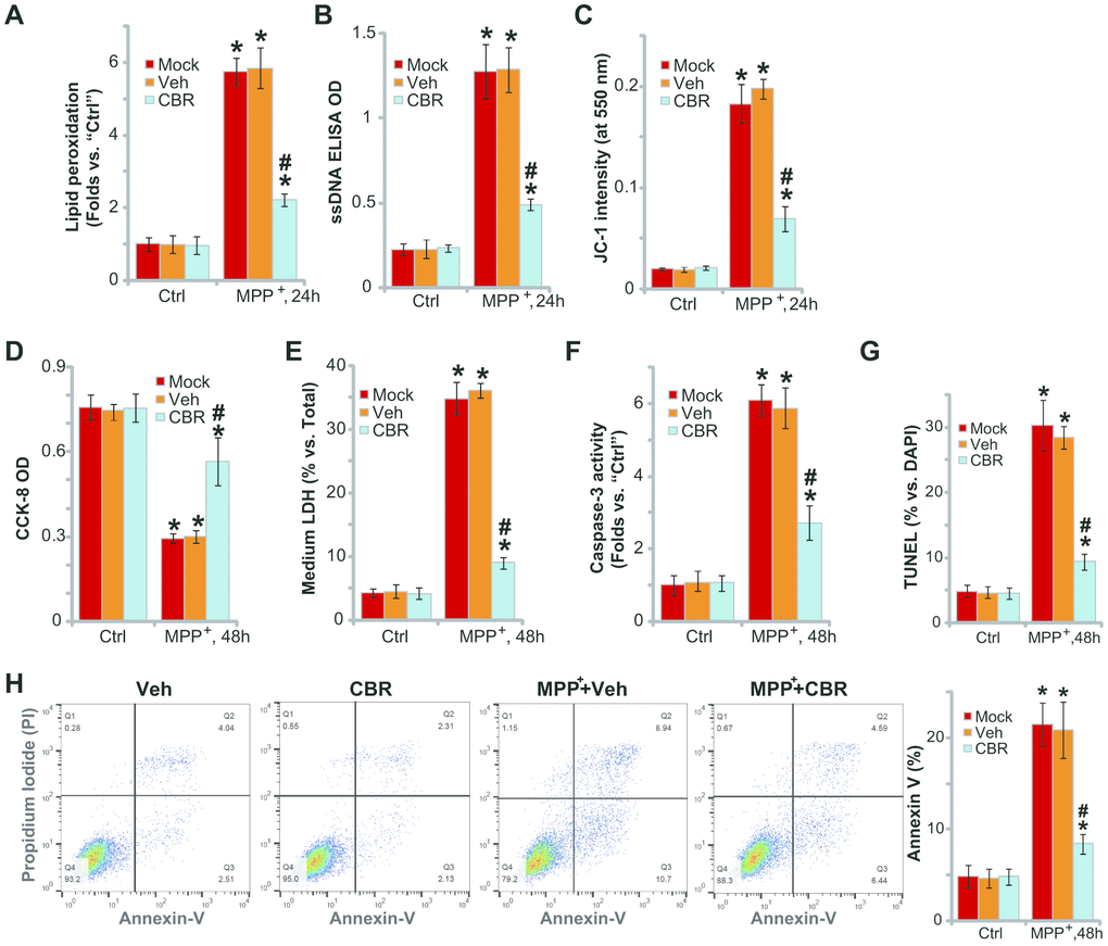 In functional studies, we found that MPP+-induced significant viability (CCK-8 OD) reduction (Figure 2D) and cell death (medium LDH release, Figure 2E), which were attenuated with CBR-470-1 pretreatment (Figure 2D, 2E). MPP+ induced profound apoptosis, evidenced by increases in caspase-3 activity (Figure 2F), nuclear TUNEL staining (Figure 2G) and Annexin V-positive cell ratio (Figure 2H). Significantly, pretreatment of SH-SY5Y cells with CBR-470-1 ameliorated MPP+-induced apoptosis (Figure 2F, 2H). CBR-470-1 treatment alone did not adversely change the function of SH-SY5Y cells (Figure 2A–2H). Collectively, these results show that CBR-470-1 inhibited MPP+-induced oxidative injury in SH-SY5Y neuronal cells.