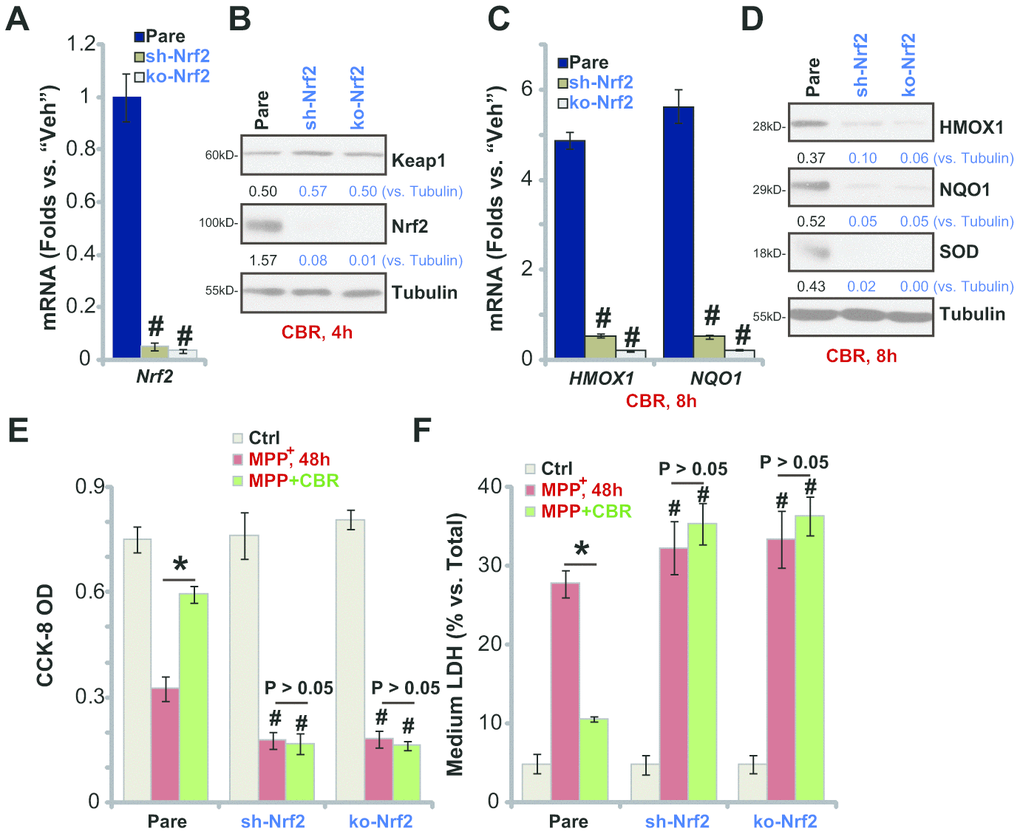 To confirm that the Nrf2 signaling cascade activation is required for CBR-470-1-induced cytoprotection against MPP+, a lentiviral Nrf2 shRNA was stably transduced into SH-SY5Y cells, resulting in an over 95% reduction of Nrf2 mRNA (“sh-Nrf2” cells, Figure 3A). Furthermore, a lenti-CRISPR/Cas9-Nrf2 KO construct was utilized to knockout (KO) Nrf2 in SH-SY5Y cells (“ko-Nrf2” cells, Figure 3A). As shown, CBR-470-1-induced cytosolic accumulation of Nrf2 protein was completely blocked in sh-Nrf2 cells and ko-Nrf2 cells (Figure 3B). Furthermore, CBR-470-1-induced mRNA and protein expression of Nrf2 pathway genes, HMOX1, NQO1 and SOD, were completely blocked with Nrf2 silencing or KO (Figure 3C, 3D). Functionally, MPP+-induced viability (CCK-8 OD) reduction (Figure 3E) and cell death (testing medium LDH percentage, Figure 3F) were enhanced in sh-Nrf2 cells and ko-Nrf2 cells. Therefore,Nrf2 depletion renders CBR-470-1 ineffective against MPP+-induced cytotoxicity in SH-SY5Y cells (Figure 3E, 3F). These results suggest that Nrf2 signaling is required for CBR-470-1-induced cytoprotection in MPP+-treated SH-SY5Y cells.