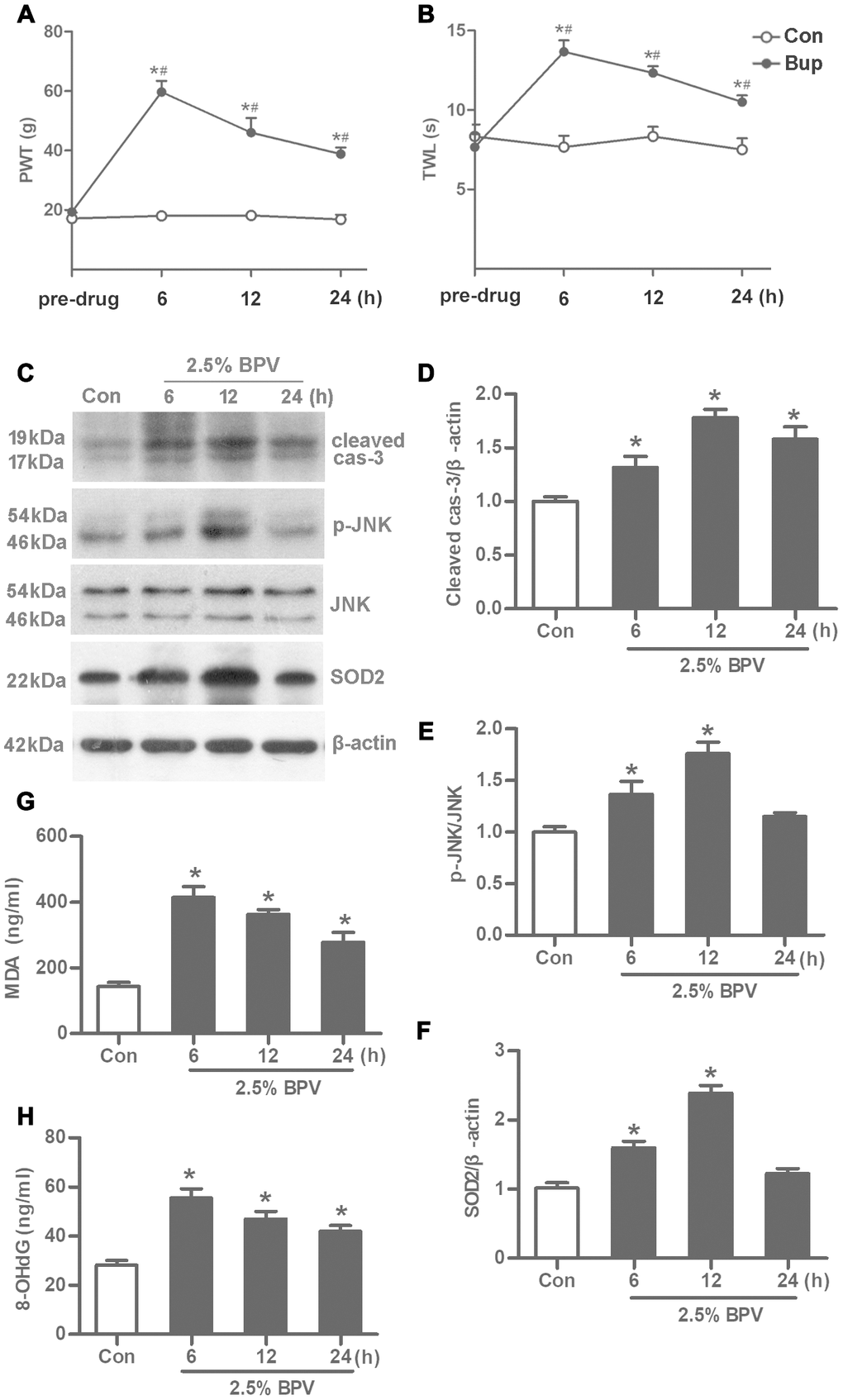 After intrathecal injection of 2.5% BPV, JNK phosphorylation and SOD2 expression were elevated in 6th h and 12th h in spinal cord of rats (vs. pre-drug, P< 0.05, Figure 1C–1F). Spinal cord oxidative injury was measured with malondialdehyde (MDA) and 8-hydroxydeoxyguanosine (8-OHdG) generation. MDA and 8-OHdG production significantly were increased in 6th h, 12th h and 24th h after intrathecal injection of 2.5% BPV in spinal cord of rats (vs. group Con, P< 0.05, Figure 1G, 1H).