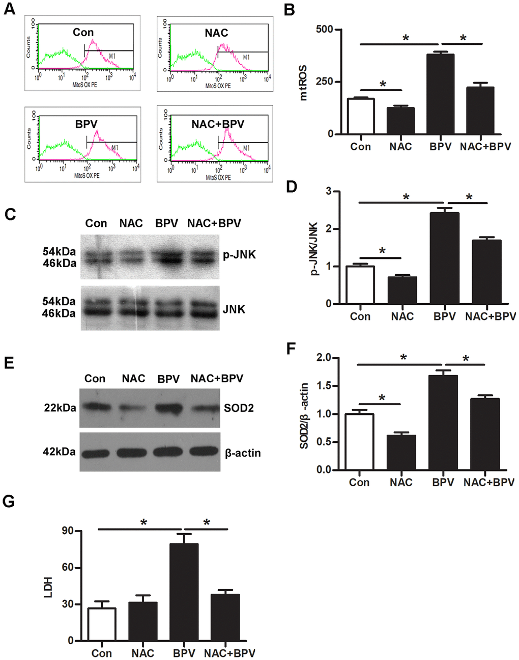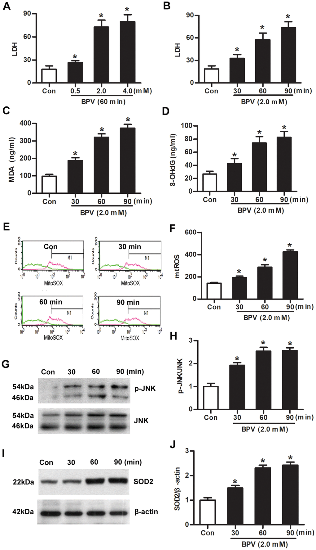 Next, cells were cultured with 2.0 mM BPV for 30, 60, or 90 min. Oxidative injury (LDH, MDA, 8-OHdG and mtROS generation), JNK phosphorylation and SOD2 expression were measured. Oxidative injury was significantly elevated in cells treated with BPV in 30, 60, or 90 min (vs. group Con, P< 0.05, Figure 2B–2D). BPV stimulated an increase of JNK phosphorylation and SOD2 transcription that paralleled mtROS generation (vs. group Con, P< 0.05, Figure 2E–2J).