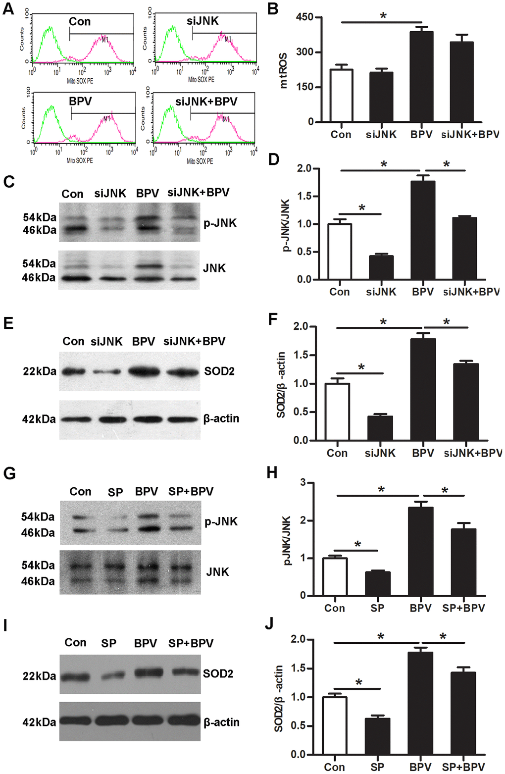 Next, small interfering RNA (siRNA) and sp600125 (an inhibitor of JNK signaling) were employed to confirm the mechanic of JNK signaling in SOD2 transcription. Down-regulation of JNK expression significantly decreased SOD2 transcription in cells (group siJNK vs. group Con, P< 0.05). Simultaneously, the same effect can be achieved at inhibiting activation of JNK signaling (group SP vs. group Con, P< 0.05). More importantly, SOD2 transcription was significantly inhibited in group siJNK+BPV or group SP+BPV (vs. group BPV, P< 0.05). However, JNK gene knock-down had no effect on BPV-induced mtROS production (group siJNK+BPV vs. group BPV, P> 0.05). (Figure 4)
