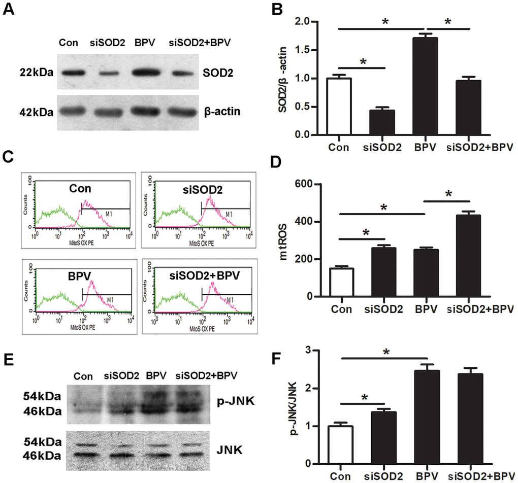 Further, the effect of SOD2 gene knock-down on JNK phosphorylation was determined. The results showed that SOD2 gene knock-down elevated JNK phosphorylation in group siSOD2 (vs. group Con, P< 0.05). However, it had no effect on JNK phosphorylation in group siSOD2+BPV (vs. group BPV, P> 0.05). (Figure 5E and 5F)