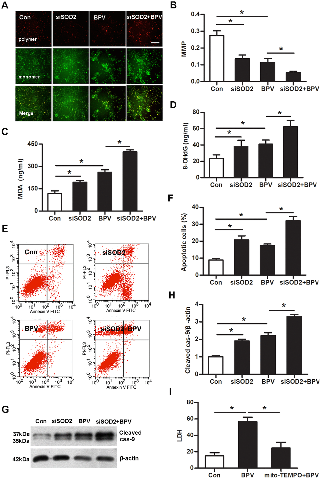 Mitochondrial depolarization was measured with JC-1 staining. Mitochondrial membrane potentials (MMP) was declined in group siSOD2 or group BPV (vs. group Con, P< 0.05). SOD2 gene knock-down significantly aggravated BPV-induced the decrease of MMP (group siSOD2+BPV vs. group BPV, P< 0.05). MDA and 8-OHdG production were increased in group siSOD2 or group BPV (vs. group Con, P< 0.05). This effect was further exacerbated in group siSOD2+BPV (vs. group BPV, P< 0.05). The cells apoptosis was detected by flow cytometry and cleaved caspase-9 expression. Cells apoptosis was elevated in group siSOD2 or group BPV (vs. group Con, P< 0.05). SOD2 gene knock-down significantly enhanced BPV-induced cells apoptosis (group siSOD2+BPV vs. group BPV, P< 0.05). As a control antioxidant in mitochondria, mito-TEMPO was used to protect cells against oxidative injury and 25 μM mito-TEMPO performed significant oxidation resistance in SH-SY5Y cells as previously described [23]. So, this concentration of mito-TEMPO was used to preculture cells and it could attenuate BPV-induced neurotoxic injury (group mito-TEMPO+BPV vs. group BPV, P< 0.05). (Figure 6)