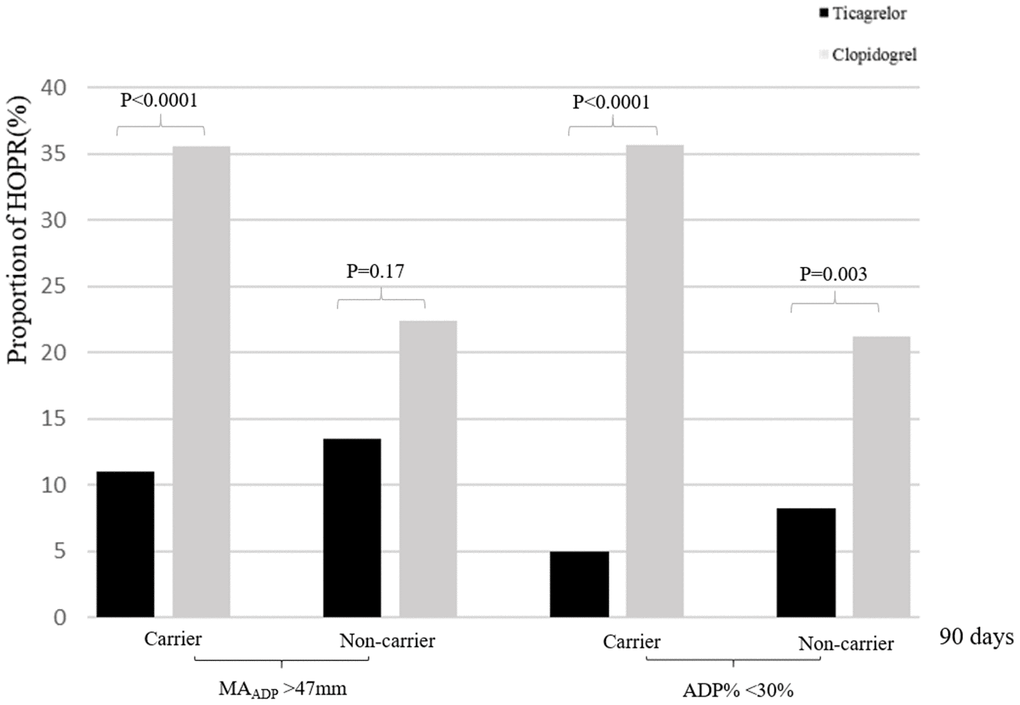 In TEG subgroup, 189 patients (55.8%) were CYP2C19 LOF allele carriers and 150 (44.2%) were non-carriers. At 7+2 days, the proportion of HOPR on aspirin was significantly different between two treatment groups among carriers (AA% < 50%, 7.8% versus 21.9%; P = 0.007), but not among non-carriers (AA% < 50%, 11.7% versus 19.7%; P = 0.18). The proportion of HOPR on ticagrelor or clopidogrel was significantly lower in ticagrelor/aspirin group versus clopidogrel/aspirin group among carriers and non-carriers. At 90±7 days, compared with clopidogrel/aspirin group, ticagrelor/aspirin group had a lower proportion of HOPR among carriers (MAADP > 47mm, 11.0% versus 35.6%, P < 0.001), but no significant difference was found among non-carriers (MAADP > 47mm, 13.5% versus 22.4%, P = 0.17). However, no significant treatment-by-genotype interactions were found (P for interaction = 0.19) (Table 4, Figure 1).