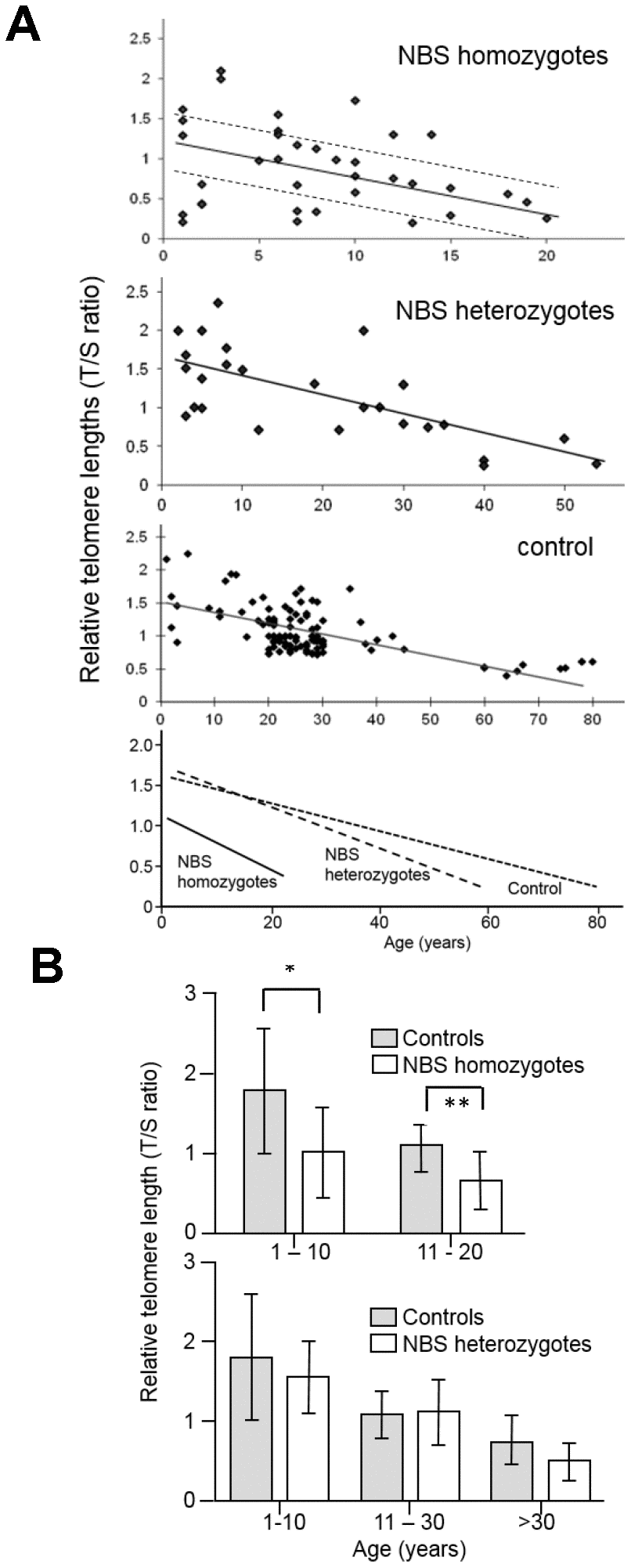 Figure 1. (A) Relative telomere length (TL) as a function of age in NBS homozygotes, heterozygotes, and control individuals. Relative TL (T/S ratio) was analyzed from blood samples of 38 NBS homozygotes, 27 NBS heterozygotes, and 108 control individuals by quantitative polymerase chain reaction (qPCR). The dashed lines separate the NBS homozygotes in those with long, medium, and short TL. Below: regression curves standardized for age. Original after thesis Raneem Habib [28]. (B) Comparison of TL, as analyzed by qPCR, of NBS homozygotes, heterozygotes, and controls. The comparison was made for age-matched groups (mean values and standard deviation). * indicates p<0.01; ** indicates p<0.001.