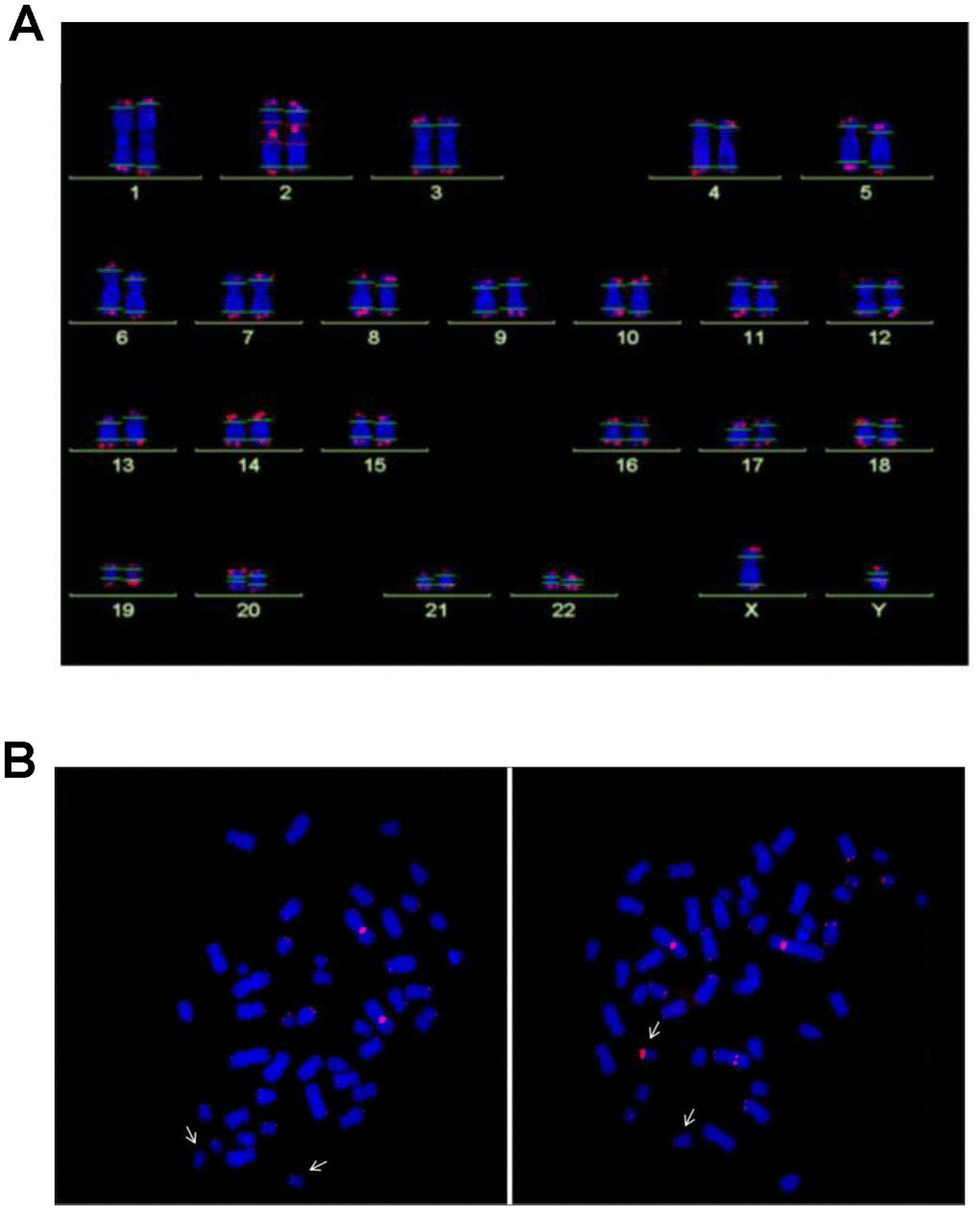 Figure 2. (A) Analysis of telomere length by Q-FISH. Normal karyogram with single telomeres stained for telomere repeats (Q-FISH) and a repetitive region in the centromeric region of chromosome 2. The horizontal lines overlaid on each chromosome define the measurement areas. (B) Metaphases of the NBS LCL 94P0307 after Q-FISH of the NBS cell line 94P0307 with very short telomeres and a telomere fusion. The arrows point to chromosomes 19. Left panel, Metaphase with weak telomerice fluorescence of both chromosomes 19; Right panel, Metaphase with one chromosome 19 with a brightly fluorescent telomere of the p-arm. The other bright signal is the reference region of chromosome 2. Original after thesis Raneem Habib [28].