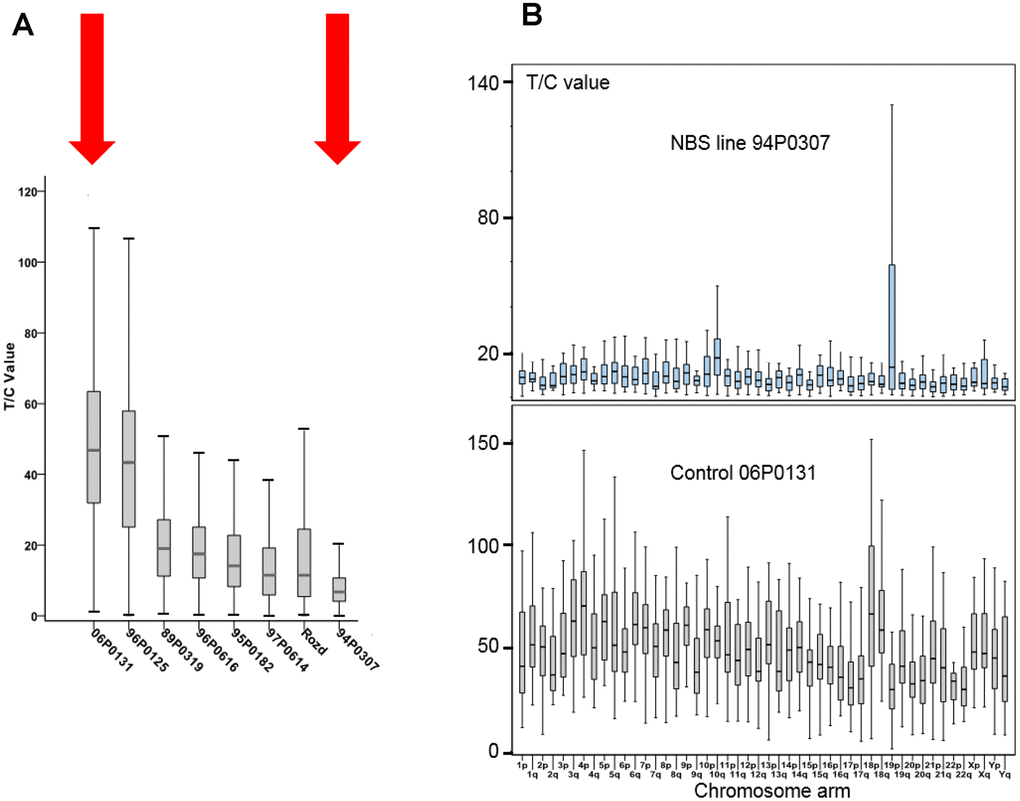 Figure 3. (A) Total telomere length (TL) analysed by Q-FISH. TL of six NBS lymphoblastoid cell lines and two control lines (06P0131 and 96P0125) was analyzed by Q-FISH. The boxplot presents the median, the minimum and the maximum T/C values. (B) Individual TLs of the NBS line 94P0307 and the control line 06P0131 (red arrows in Figure 3A) analyzed by Q-FISH of 15 metaphases. The boxplot presents the median, the minimum and maximum T/C values. Note the huge variability in TL of the short arm of one chromosome 19 (19p). Original after thesis Raneem Habib [28].