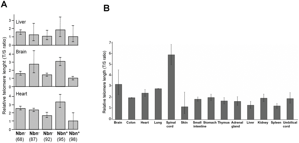 Figure 4. (A) Relative telomere length (TL) of three tissues of humanized Nbs mice as estimated by qPCR. Relative TL (T/S ratio) in brain, heart, and liver tissues of humanized Nbs mice (Nbn-/-NBNdel, in the figure labelled Nbn-) 87, 68 and 92 (age: 32, 41, and 39 days) and humanized wild-type mice (Nbn-/-NBN+, in the figure labelled Nbn+): 95 and 98 (age: 32 days) estimated by qPCR. (B) Relative TL of an NBS fetus. Relative TL ±SD (T/S ratio) in 14 different tissues of a 32 week old NBS-fetus estimated by qPCR. Original from [28].