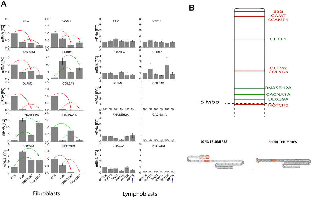 Figure 5. (A) mRNA expression of TPE-OLD candidate genes in cells with normal/short telomeres and artificially elongated telomeres in the presence of hTERT. qPCR analysis was performed in a healthy human fibroblast cell line, a NBS fibroblast cell line, and in all 6 available lymphoblastoid cell lines (LCLs). Total mRNA was extracted from proliferating fibroblasts and from the same cell lines proliferating with experimentally elongated telomeres, after immortalization with hTERT. In LCLs, mRNA from the 6 different donors was compared. One of these cell lines (94P307) showed extremely elongated telomeres on p19. The genes were identified as TPE-OLD candidates by use of Affymetrix gene chip experiments in independent cell lines from healthy controls and HGP patients (as described in Supplementary Tables 7–8 and Supplementary Figures 5–8). All values were normalized to the level (=1-fold) of mRNA in unmodified and pre-senescent control fibroblasts. Each assay was performed in triplicate. Red arrows mark the genes with attenuated regulation in NBS (short telomeres in pre-senescent vs. long telomeres in hTERT infected cells). Green arrows mark the genes with reversed regulation in NBS (dark green: downregulated in pre-senescence in controls; light green upregulated). The blue arrow marks the LCL with extremely long telomeres on 19p. BSG: basigin; GAMT: guanidinoacetate methyl-transferase; SCAMP4: secretory carrier membrane protein 4; OLFM1: olfactomedin 1; UHRF1: ubiquitin like with PHD and ring finger domains 1; COL5A3: collagen type V alpha 3 chain; RNASEH2A: ribonuclease H2 subunit A; CACNA1A: calcium voltage-gated channel subunit alpha1 A; DDX39A: DExD-box helicase 39A; NOTCH3: Notch receptor 3. ND, non detectable (mRNA quantifications with Ct values above 35). Borderline Ct values were detected for NOTCH3 for the LCL 95P182 (mean Ct = 34.9) and 59P319 (mean Ct = 34.6), not shown in the figure. (B) TPE-OLD concept. Telomeres loop to specific loci to regulate gene expression, a process termed telomere position effect over long distance [31]. The effect may likely extend to a distance of at least 10-15 Mbp from the telomere. The marked TPE-OLD gene candidates on 19p were investigated in experiments shown in Figure 5A: BSG, GAMT, SCAMP4, OLFM2, COL5A3, CACNA1A, NOTCH3 (upregulated in pre-senescent cells), and UHRF1, DDX39A and RNASEH2A (downregulated in senescent cells). TPE-OLD genes may form clusters with reverse regulation in NBS (green) further away from the telomere.