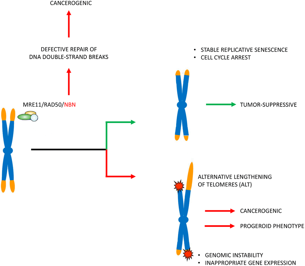 These results are important to a better understanding of the role of telomere attrition in carcinogenesis per se. It is generally accepted that telomere attrition drives genomic instability and that the subsequent acquisition of hTERT expression and telomerase activity is involved in cancer immortality [59]. This model is supported by clinical findings showing that short telomeres are an important risk factor for malignant transformation [57]. On the other hand, longer telomeres can be a predictor for poor outcome after a tumor has developed [60]. This, at first glance, contradictory observation is usually attributed to higher telomerase activities (and thus a higher “degree” of immortality) in tumor patients with poor outcome. However, other findings indicate that the activation of telomerase may occur early in tumor development [59, 61]. The exact temporal sequence of telomerase activation, telomere shortening and malignant transformation is not clear. The data presented here illustrate the double-edged sword of telomere shortening in NBN founder mutation carriers with lymphoid malignancies (and thus confirm the current concept) but also show an alternative explanation for the correlation between TL and tumor progression: lower apoptosis and/or increased replicative senescence rates due to short telomeres and thus relative protection against new tumors (summarized in Figure 6). This may have important therapeutic implications. For example, hematopoietic stem cell transplantation (HSCT) appears to be a promising therapeutic strategy for some but not all NBS patients [62]. From a therapeutic point of view, our data suggest that telomere stabilization should indeed be the goal for NBS (and possibly other tumor) patients before cancer onset, but after cancer has already developed, “keeping telomeres short” would probably be more useful. Considering new therapeutic options for influencing telomeres [58] these findings could become clinically relevant for this and other cancer-predisposing mutations with involvement of telomere attrition and/or dysfunction.