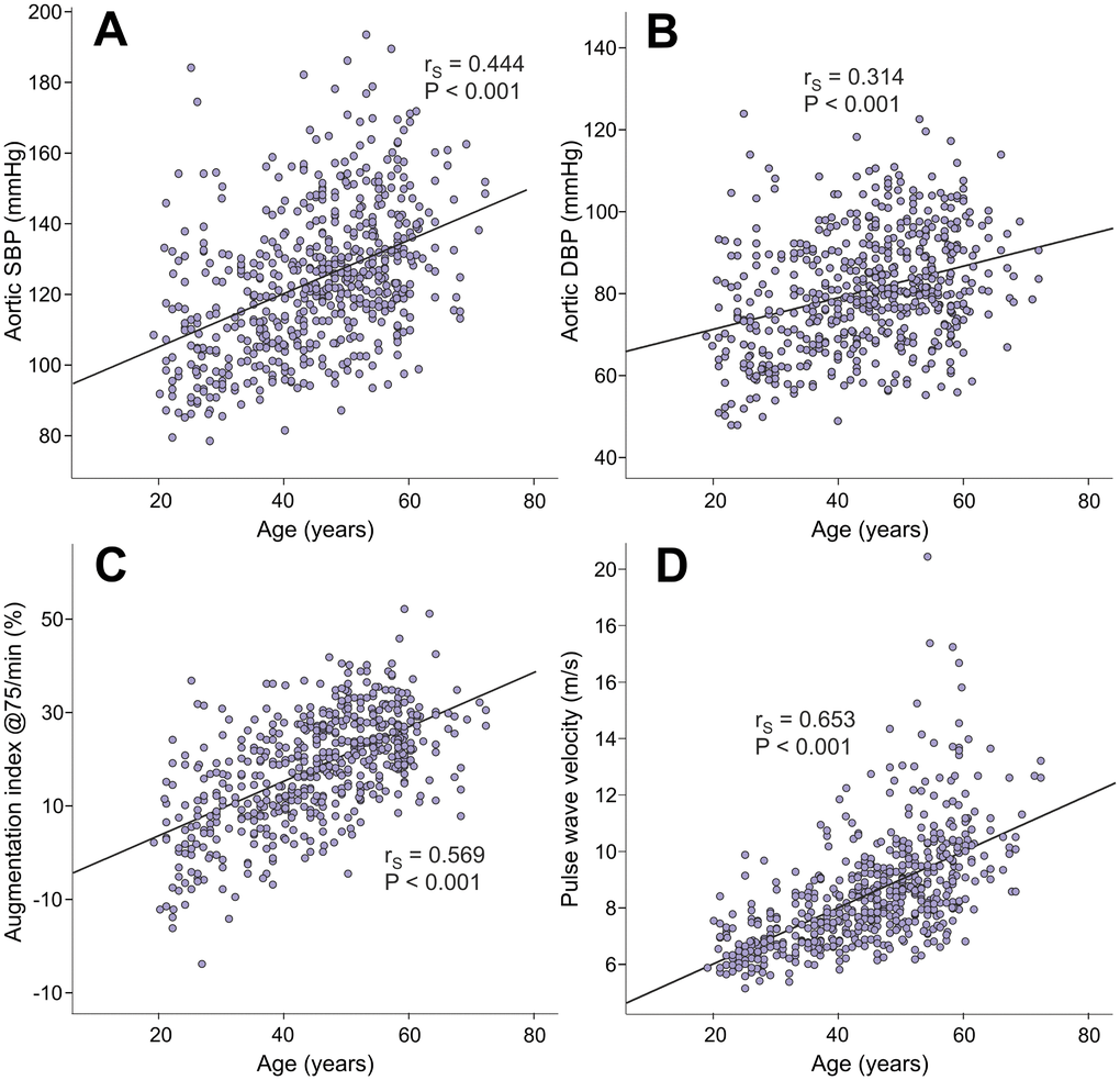 Age directly correlated with aortic systolic BP (rS=0.444), aortic diastolic BP (rS=0.314), AIx@75 (rS=0.569), and PWV (rS=0.653) (Figure 1). Age also correlated with SVRI (rS=0.290, p<0.001), but not with heart rate, ventricular ejection duration, or stroke volume (rS range from -0.016 to 0.020, p value range from 0.636 to 0.884). Of note, the variables BP, PWV, systemic vascular resistance, heart rate, ventricular ejection duration, and stroke volume are all hemodynamic determinants of AIx [21–23].