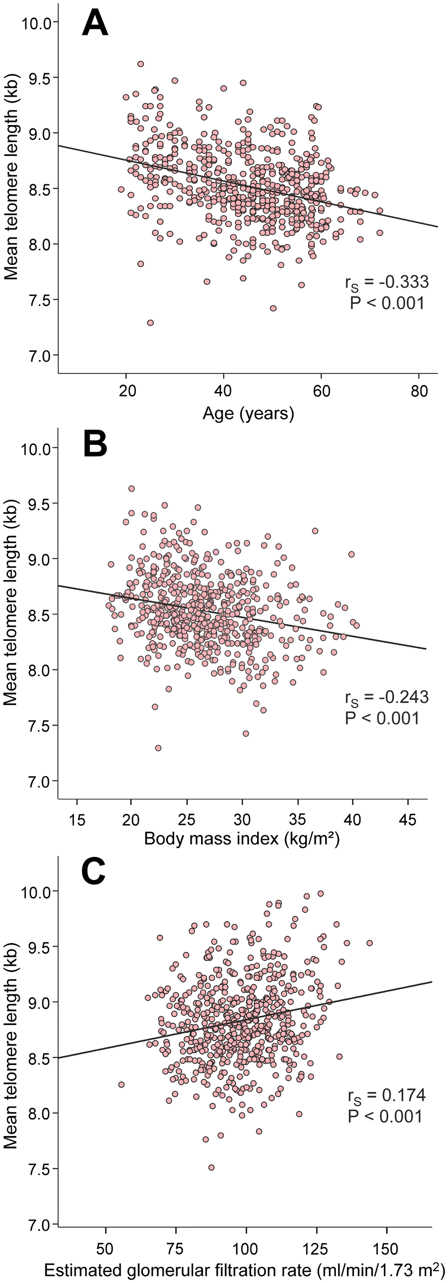 The factors that are known to influence LTL presented with expected results: age (rS=-0.333) and BMI (rS=-0.243) were inversely correlated, while eGFR (rS=0.174) was directly correlated with mean LTL (Figure 2).