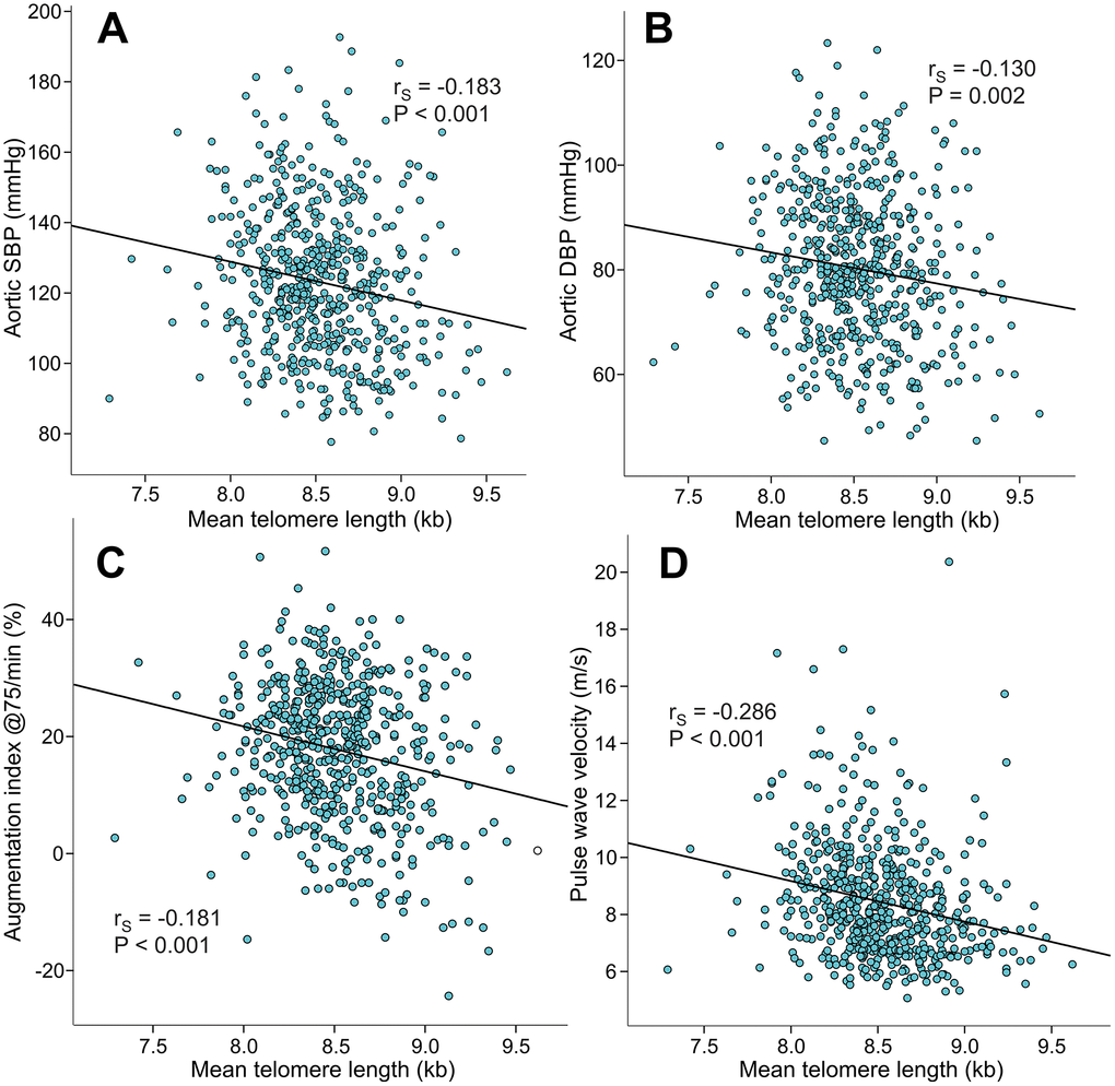 Mean LTL inversely correlated with aortic systolic BP (rS=-0.183), aortic diastolic BP (rS=-0.130), AIx@75 (rS=-0.181), PWV (rS=-0.286) (Figure 3), and SVRI (rS=-0.108, p=0.010). Mean LTL also inversely correlated with the magnitude of AIx (i.e. variable of wave reflection that was not adjusted for heart rate 75/min; rS=-0.188, p<0.001, Supplementary Figure 1). Mean LTL did not correlate with heart rate (rS=-0.021, p=0.369) or cardiac index (rS=-0.025, p=0.547), but was also inversely correlated with office systolic BP (rS=-0.167, p<0.001) and office diastolic BP (rS=-0.158, p<0.001).