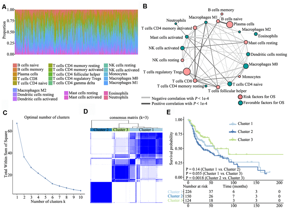 Further, we performed unsupervised consensus clustering of all tumor samples for the molecular classification of HNSCC. The optimal number of clusters was determined by the K value. After assessing relative changes in the area under the cumulative distribution function curve and consensus matrix heatmap, we selected a three-cluster solution (K = 3), which showed no appreciable increase in the area under the cumulative distribution function curve (Figure 1C). To gain further insights into the molecular heterogeneity of HNSCC, unsupervised consensus clustering was performed to explore discernible patterns of the TME clusters. Based on the consensus matrix heatmap, three distinct TME-based molecular clusters were identified (Figure 1D). To further clarify the clinical implications of these clusters, we performed Kaplan–Meier curve analyses to elucidate the association between them and clinical prognosis. Notably, survival analysis based on the TME phenotypes indicated that TME cluster 3 (n = 124) was significantly associated with better prognosis and that TME cluster 2 (n = 150) was associated with poorer prognosis (log-rank test, P = 0.0018). Of the 500 patients with HNSCC, 226 belonged to TME cluster 1, which was associated with intermediate prognosis (log-rank test, P > 0.05) (Figure 1E).