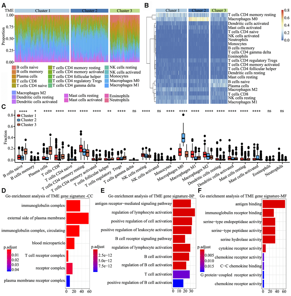 To identify biological characteristics underlying each TME phenotype, differentially expressed genes (DEGs) among the three clusters were analyzed using the limma package. In total, 306, 998 and 676 DEGs were obtained upon three comparisons (TME cluster 1 vs. TME cluster 2, TME cluster 2 vs. TME cluster 3 and TME cluster 1 vs. TME cluster 3). Overall, 622 common DEGs were further screened in the comparisons. Next, we used random forest algorithms for dimension reduction to extract phenotype signatures. Unsupervised hierarchical clustering was based on the expression of the 312 most representative D EGs (Supplementary Table 2). Gene ontology enrichment analysis of TME signature genes was conducted using the R package. Significantly enriched biological processes are summarized in Supplementary Table 3. Analyses of TME signature mRNAs indicated that within the cellular component category, immunoglobulin complex, external side of plasma membrane, T cell receptor complex and receptor complex were significantly annotated (Figure 2D). Further, within the biological process category, antigen receptor-mediated signalling pathway, regulation of lymphocyte activation, positive regulation of cell activation and positive regulation of leukocyte activation were significantly annotated (Figure 2E), and within the molecular function category, pathways involved in antigen binding, immunoglobulin receptor binding and cytokine receptor activity were significantly annotated (Figure 2F). These findings indicated that the immune landscape of the three TME clusters plays a key role in immune regulation.