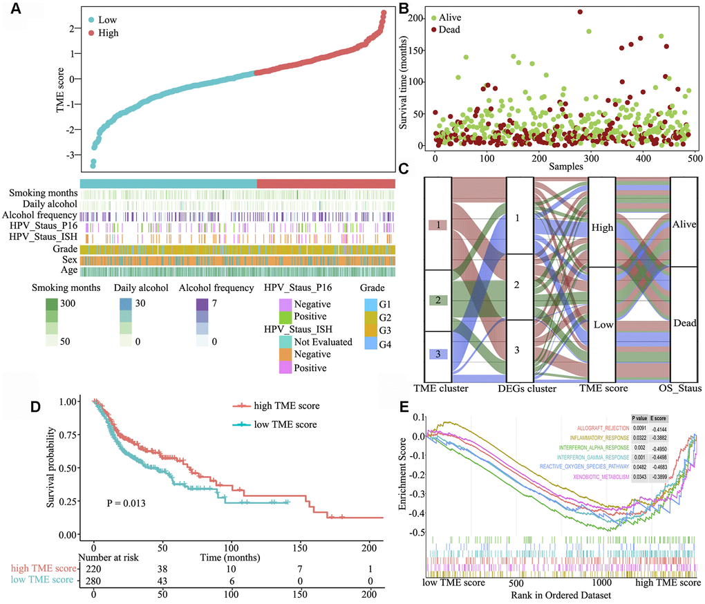 Next, we systematically classified the TME clusters according to the gene coefficient value and calculated TME score. The maxstat R package was used to identify TME score breakpoint. The distribution of risk scores and overall survival status of patients are shown in Figure 3A and 3B, respectively. TME score was calculated for all patients, and the TME score breakpoint was used to classify them into the high (n = 220) and low (n = 280) TME score groups. High TME score and was associated with favourable outcomes, and low TME score and was associated with poor outcomes (Figure 3C). Kaplan–Meier curve and Cox regression analyses further suggested that patients in the high TME score group had significantly better OS probability than those in the low TME score group [HR 1.401 (1.074–1.827), log-rank test, P = 0.013] (Figure 3D). To understand the pathway two TME score groups involved in, gene set enrichment analysis was performed, which indicated that allograft rejection (E score = −0.414; P = 0.0091), inflammatory response (E score = −0.388; P = 0.032), interferon-α response (E score = −0.495; P = 0.002), interferon-γ response (E score = −0.450; P = 0.001), reactive oxygen species (E score = −0.468; P = 0.048) and xenobiotic metabolism (E score = −0.390; P = 0.0343) pathways were significantly downregulated in the high TME score group (Figure 3E).