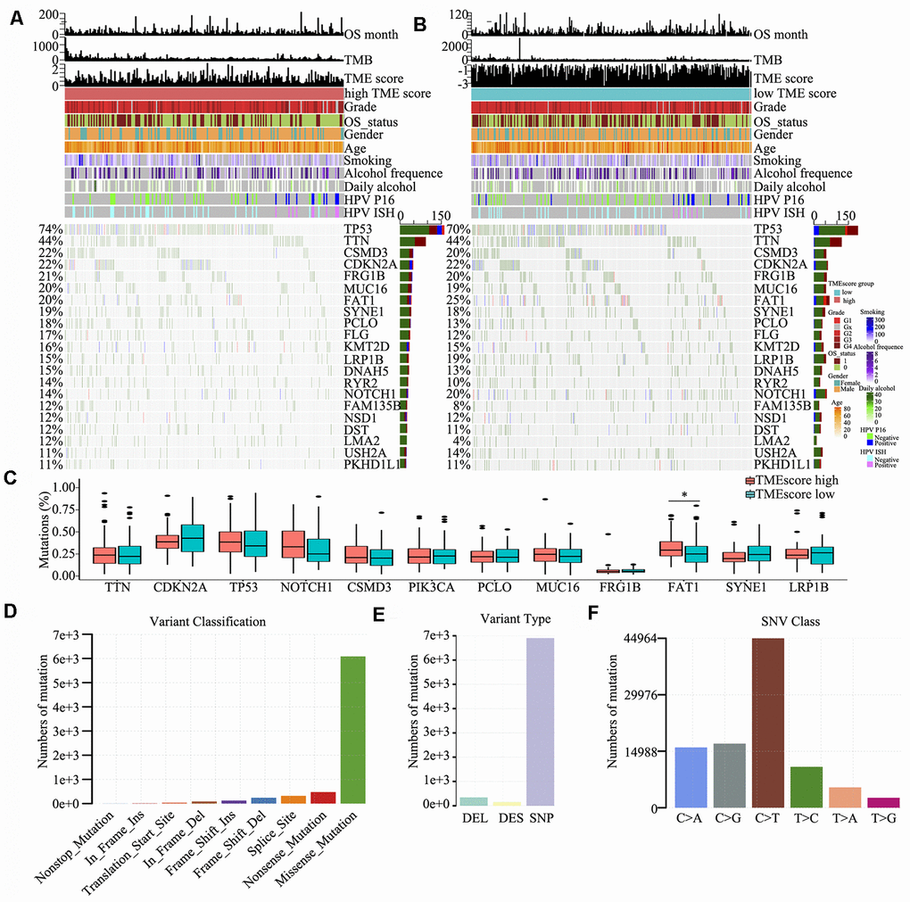 To detect driver mutations in the TME, we analysed HNSCC-related SNP data and consequently detected 21 putative driver genes, including TP53, TTN, CSMD3, CDKN2A and NOTCH1 (Figure 4A and 4B), which were associated with the TME, using random forest algorithm with 1000 iterations. The TP53 gene showed the highest mutation rate (74% vs. 70% in the high and low TME score groups, respectively), which was consistent with the findings of other studies [21–25]. The somatic mutations of TP53, TTN, CSMD3, CDKN2A, FRG1B, FAT1 and NOTCH1 were all >20% in the high and low TME score groups; in particular, FAT1 was significantly different between high TME score and low TME score groups (P < 0.05) (Figure 4C). We also found that several genes involved in the cell cycle pathway (e.g., TP53, CDKN2A, NOTCH1 and PIK3CA) were frequently altered. Clinical reports have described associations between individual altered genes and response or resistance to ICIs [26, 27]. These mutations may be associated with a change in the TME. Consequently, we further detected and classified candidate somatic mutations, which led to the identification of nine classifications; nonstop, in-frame (insert and delete), frame-shift (insert and delete), translation start, splice, nonsense and mutations were the common somatic mutations (Figure 4D). Mutation type and spectrum analyses showed that single nucleotide mutations, particularly C > T transitions at TpCpW trinucleotide sites, were the predominant type of mutations (Figure 4E, 4F).